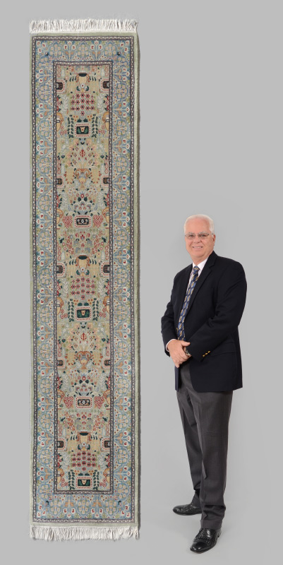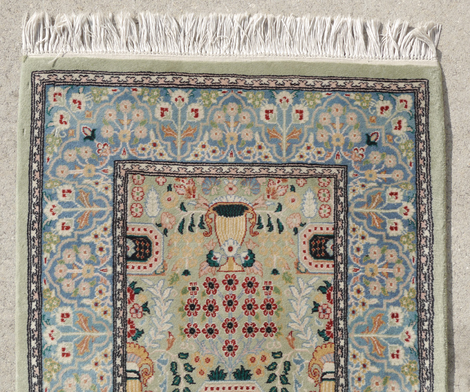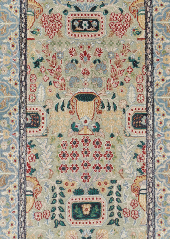 APPROX 20-35 YR OLD SINO-PERSIAN HAND KNOTTED WOOL RUNNER, 2'6'' x 10': This softly colored runner has a repeating central pattern of a rectangular platter surrounded by sprays of small flowers alternating with a large vase of flowers. These two designs run down the center of the field. On either side are half motifs of the same two patterns. The main border has a light blue ground that is covered with alternating flowering plants. The mostly pastel colors are accented by deep blue and wine color highlights. Condition is good.