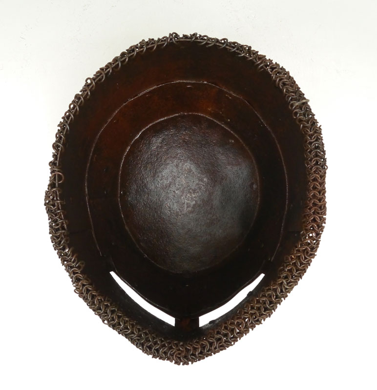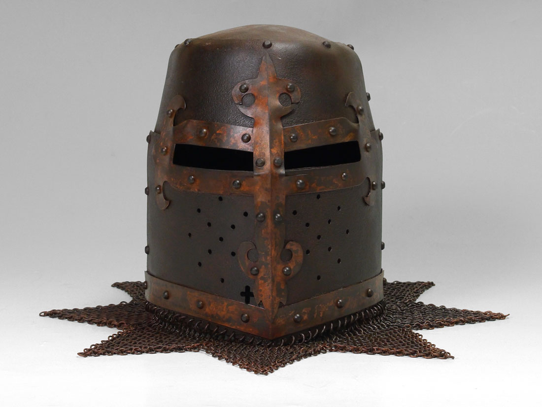 VICTORIAN GREAT HELM HELMET: Victorian copy of an iron or steel 13th century knights or infantry ''Great Helm'' helmet with applied decoration, camail attached below. Overall measures 12'' h. x 10 1/2'' x 8 1/2''.