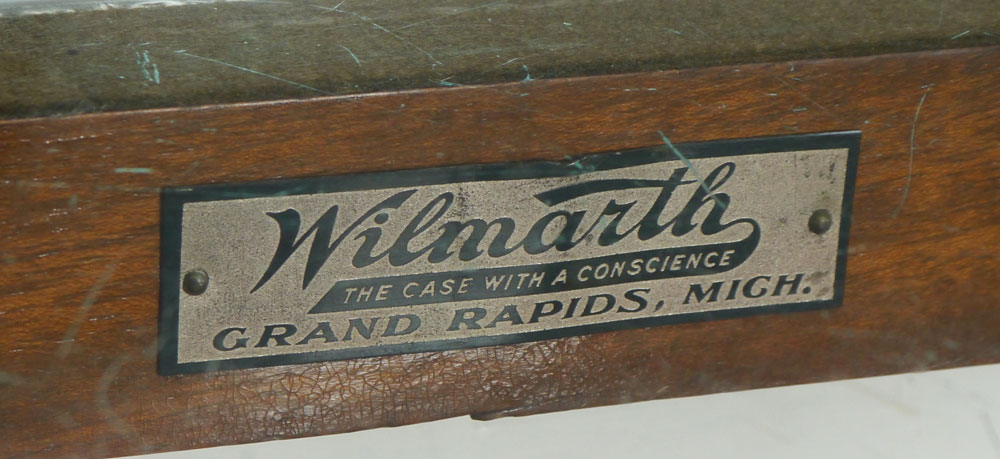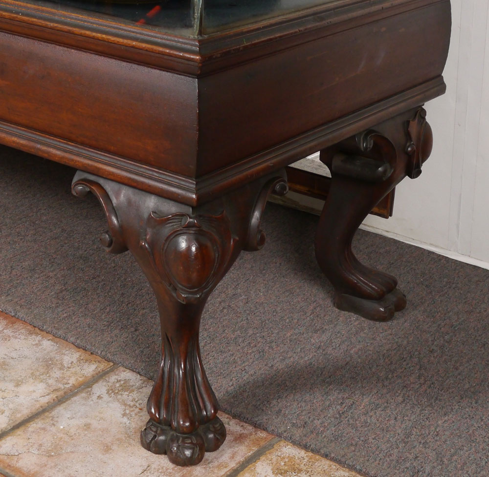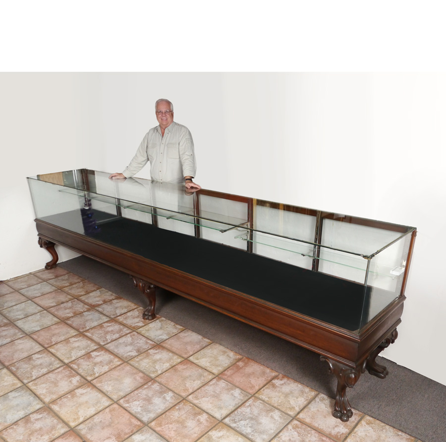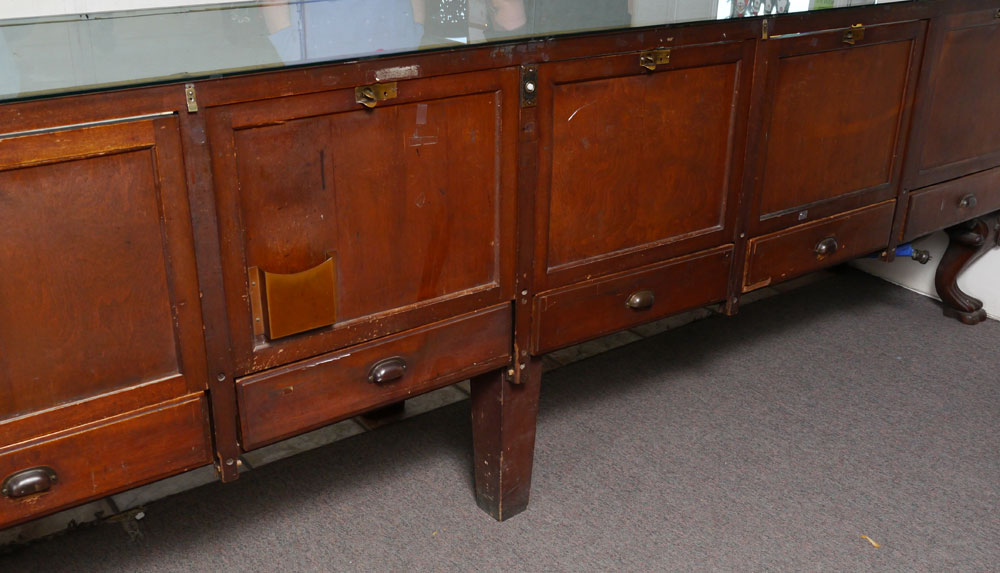 WILMARTH SHOW CASE CO. 12 FEET LONG STORE DISPLAY CASE: Top, front and sides each single pane of glass, 6 panel mirrored back doors over 6 drawers, carved paw feet, assorted adjustable glass shelves, back entry, measures approx. 39 3/4'' x 148'' x 27''. Brass Wilmarth Grand Rapids name plate.