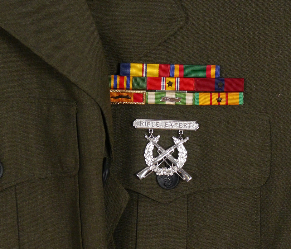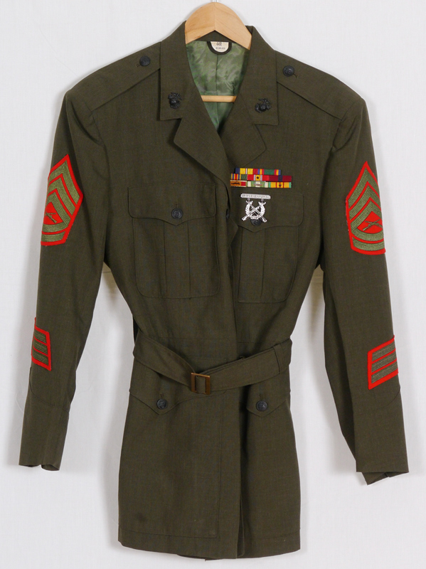 VIETNAM ERA MARINES GUNNERY SERGEANT UNIFORM: Size 44R with original insignias and decorations.