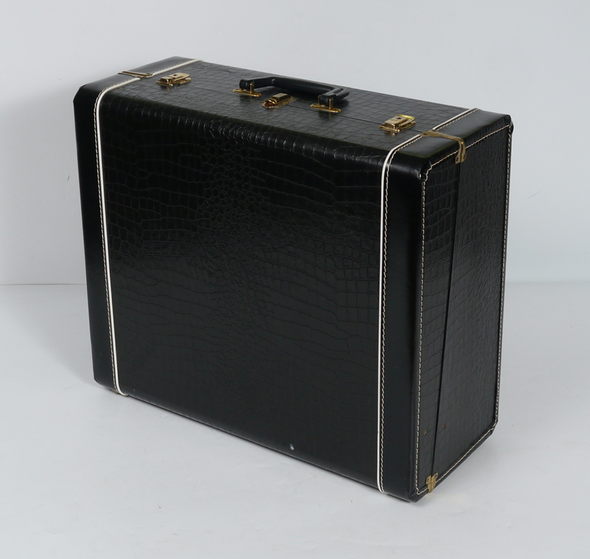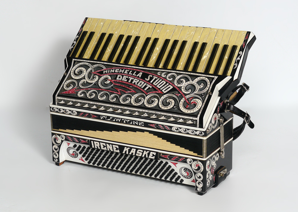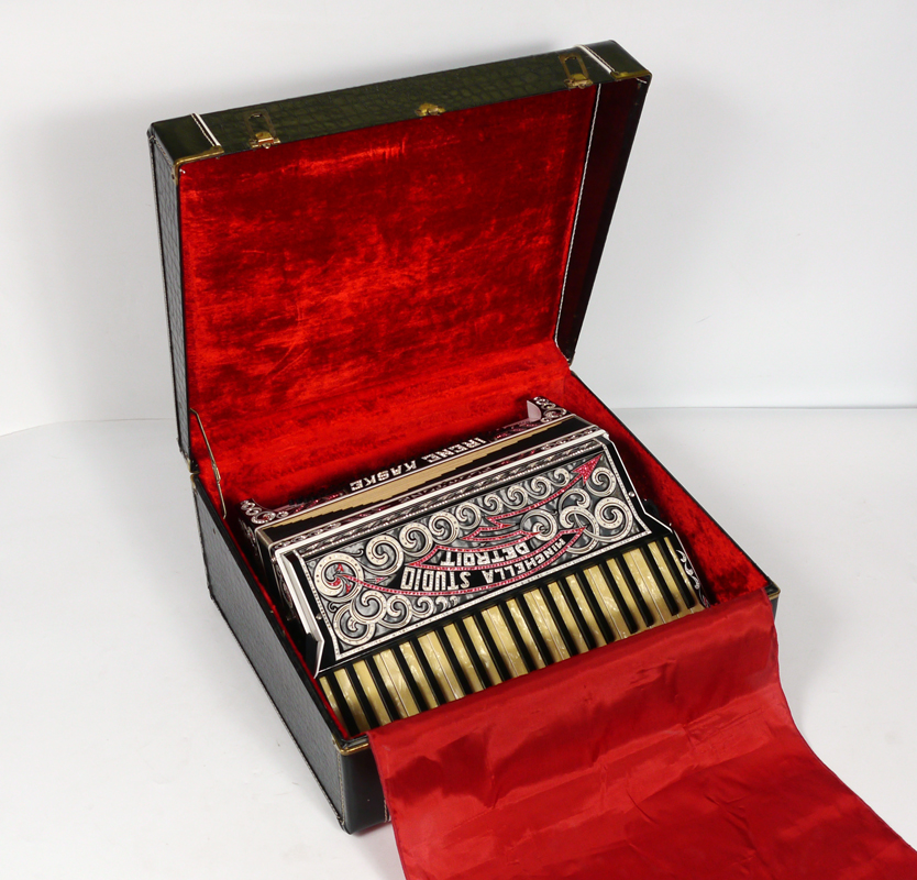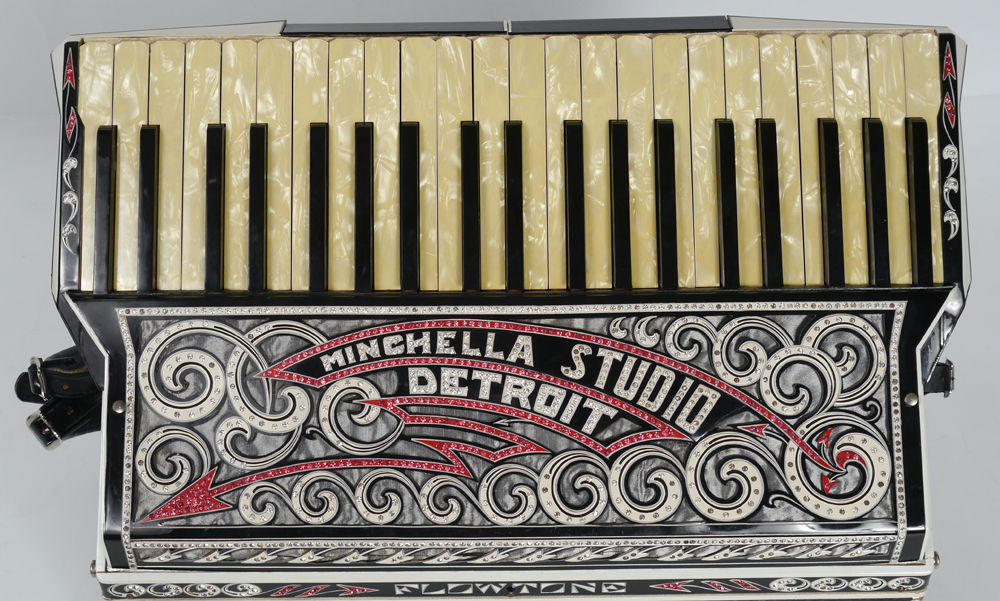 FLOWTONE RHINESTONE STUDDED ACCORDION: Ornately decorated ''Flowtone'' accordion with owner's name and ''Minchella Studio Detroit'' emblazoned on it. Faux mother of pearl keys on 41 key board. 8 1/2'' h. x 21'' x 17''. Sold with a faux alligator hard case, 10'' h. x 22 1/2'' x 19 3/4''.