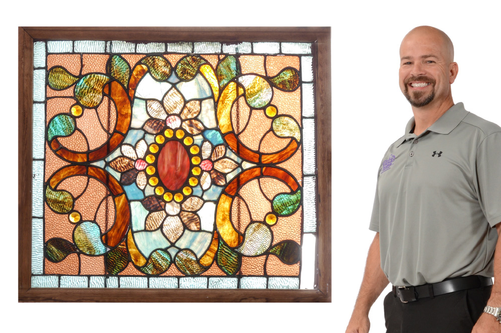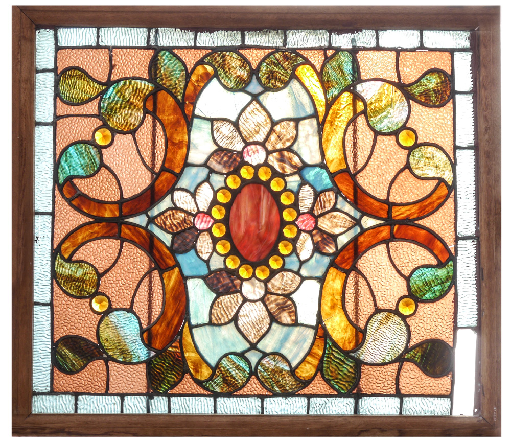 LEADED STAINED GLASS WINDOW: Cranberry slag glass central medallion with jeweled border, framed with turquoise slag, foliate scroll, border with one panel missing. Framed in wood, glass measures 26'' x 30'', framed 29''? x 32 3/4''.