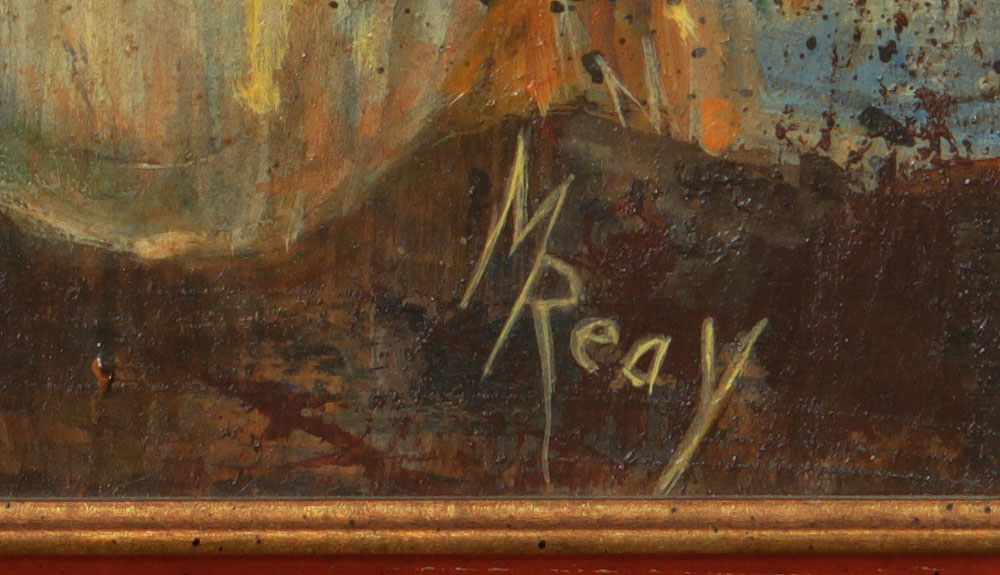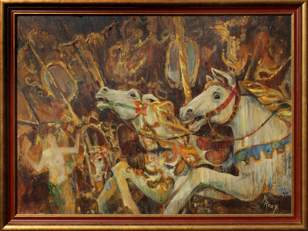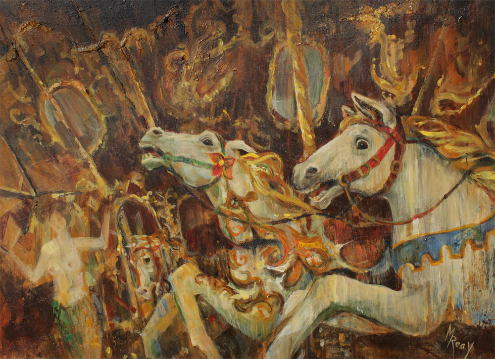 REAY, Martine, (American, 1871-): Surreal Carousel Scene with Horse and Topless Female Figure, Oil/Board, 18 3/4'' x 26 1/4'', signed lower right, framed 21 3/4'' x 28 3/8''.