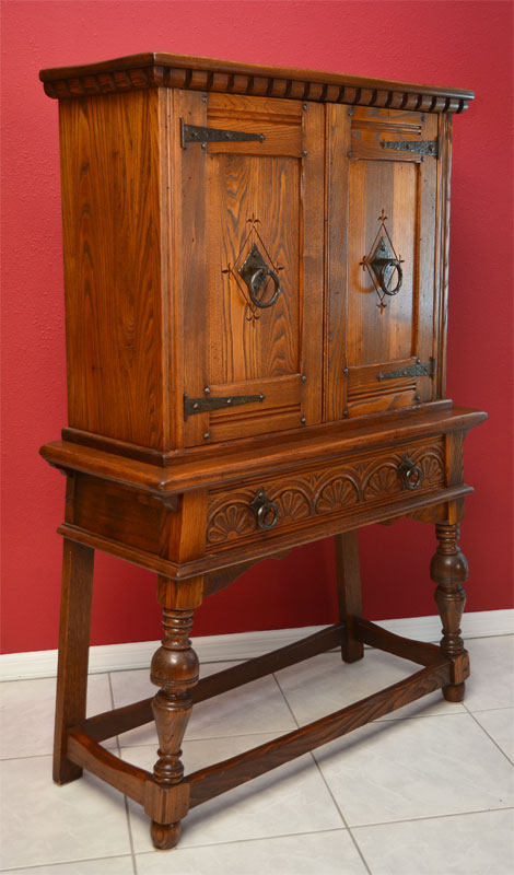 ENGLISH OAK BLIND CHINA CABINET: Dentil molding over 2 carved doors with iron hardware and tacks, 2 interior shelves. Single full length drawer with carved shell decoration over turned front legs, overall 60 1/4'' h. x 39 1/2'' x 16 1/2''.