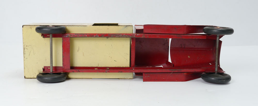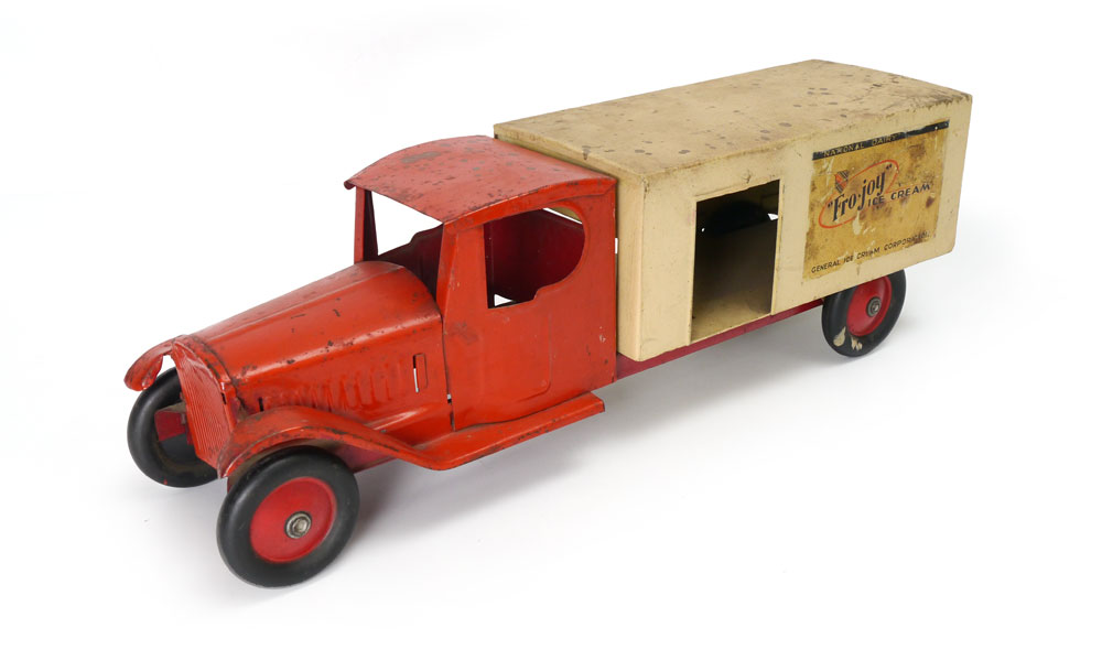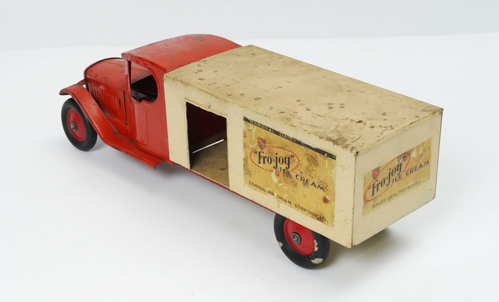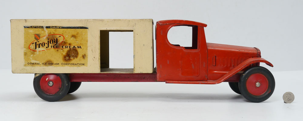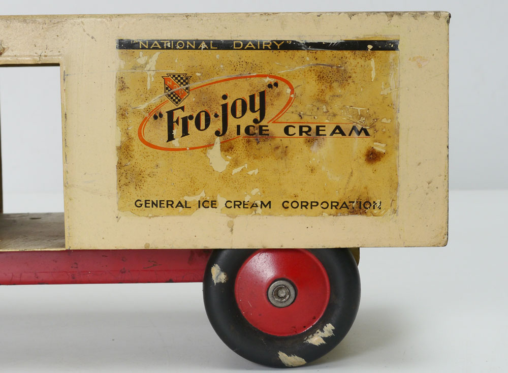 STEELCRAFT FRO-JOY PRESSED STEEL TOY TRUCK: Early 1930's pressed steel by Steelcraft advertising ''National Dairy, Fro-Joy Ice Cream, General Ice Cream Company'' with decals on sides and back. Overall measures 6 3/4'' h. x 21 3/4'' x 5 3/4''.