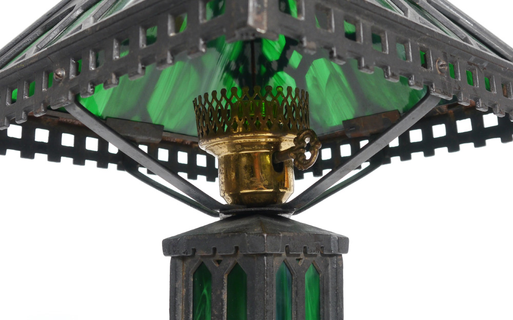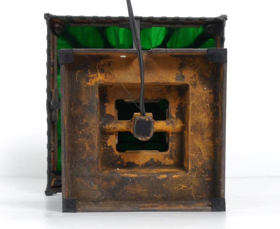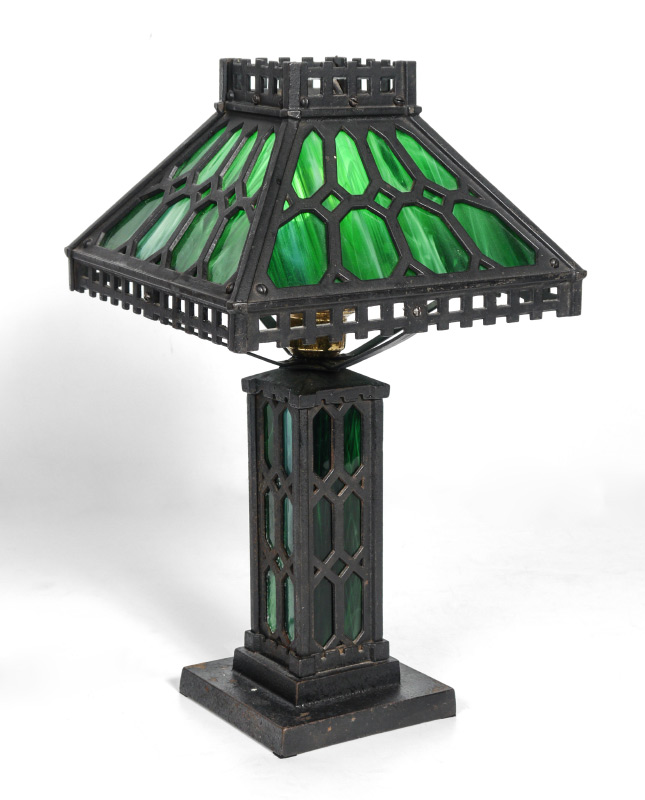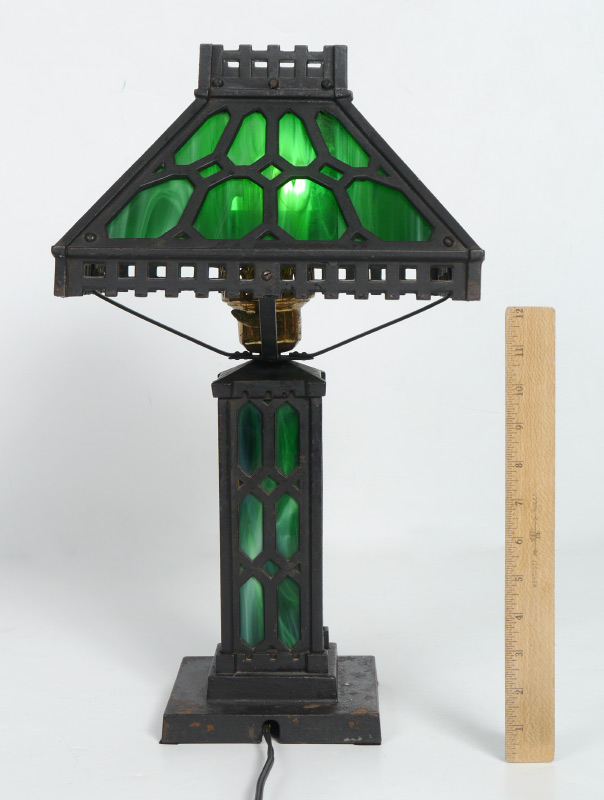 ARTS & CRAFTS SLAG GLASS LAMP: Cast iron base and frame for shade with green slag glass panels on both. No visible makers mark or label. Base 13'' h. x 10 1/4'' x 10 1/4'', shade 7'' x 1 1/8'' x 11 1/8''.