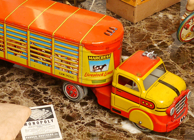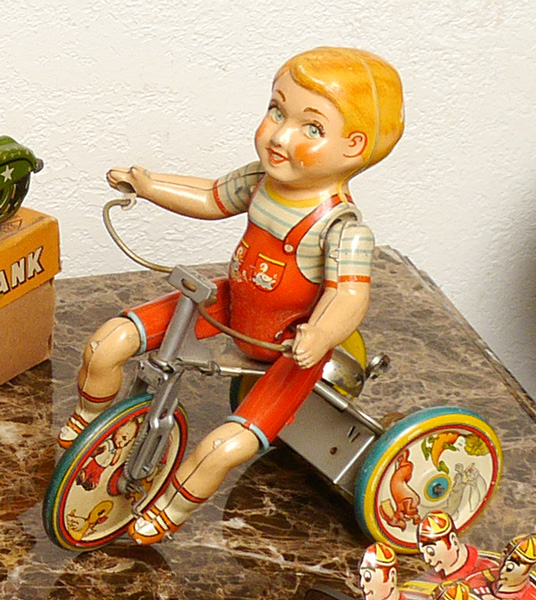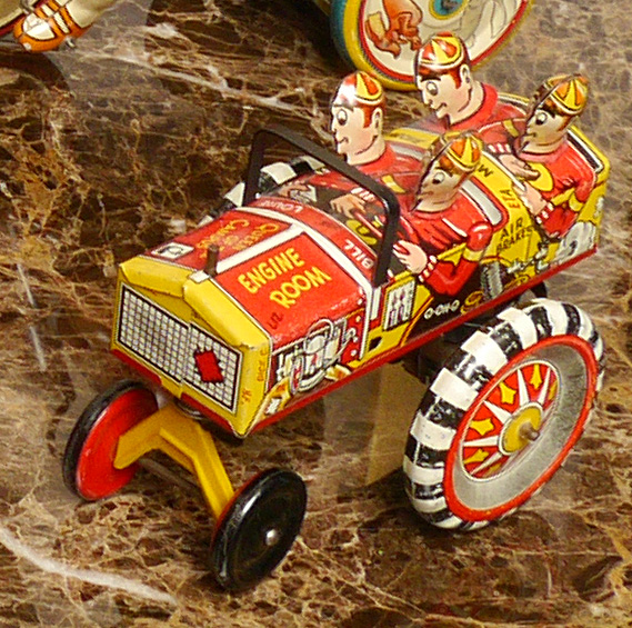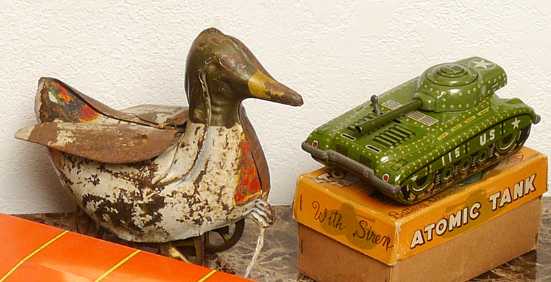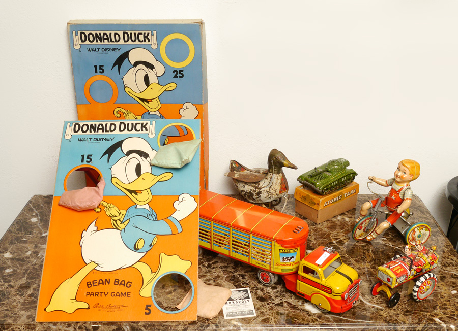 6 PIECE COLLECTION VINTAGE TOYS: 6 pieces total to include 1) Marx ''Old Jalopy'' tin litho wind up car, 4 1/4'' h. x 5 3/4'' x 4''. 2) Marx ''Marcrest Livestock Lines'' truck, 5 1/2'' h. x 17 1/2'' x 4''. 3) Unique Art Mfg. Co. ''Kiddy Cyclist'' wind-up tricycle, 8 1/2'' h. x 4 1/2'' x 7 1/2''. 4) Nihon Boeki Japanese battery operated ''Atomic Tank with Siren'' in original box, box measures 3'' h. x 6'' x 3 3/4''. 5) Duck pull toy with articulated wings, 7 1/2'' h. x 8 3/4'' x 4''. 6) Donald Duck Bean Bag Party Game, in original box, appears complete with instructions, box measures 19 1/4'' x 13 1/2''.