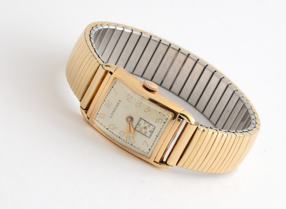 VINTAGE LONGINES TANK WATCH: Gold filled case with convex crystal, secondary seconds dial. Mechanical movement in working order. Retro fitted with a Speidel band.