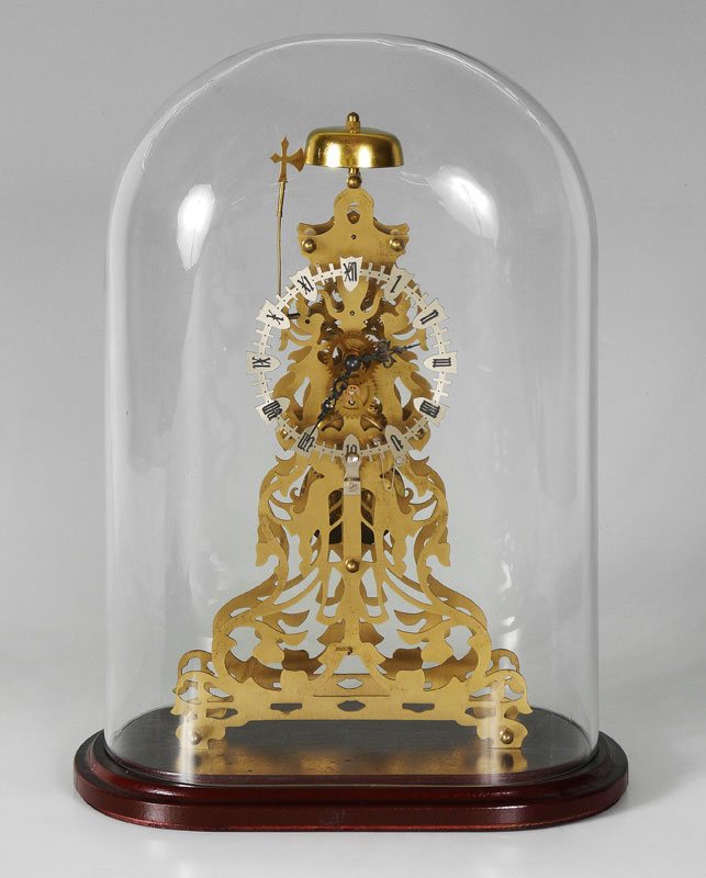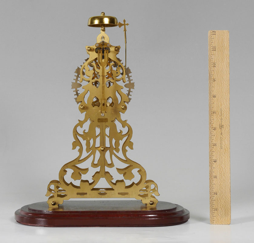 DECKERT GERMAN SKELETON CLOCK: Brass skeleton clock on wood base, marked Deckert, Western Germany, measures overall 13'' h. x 11 1/4'' x 6 1/4''. Sold with the glass dome 14'' h. x 10 1/8'' x 6''.
