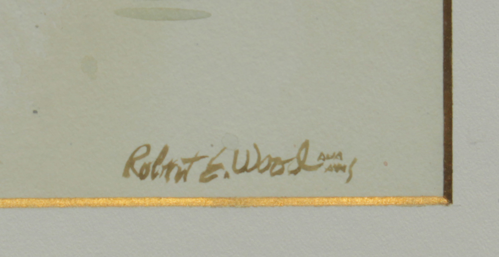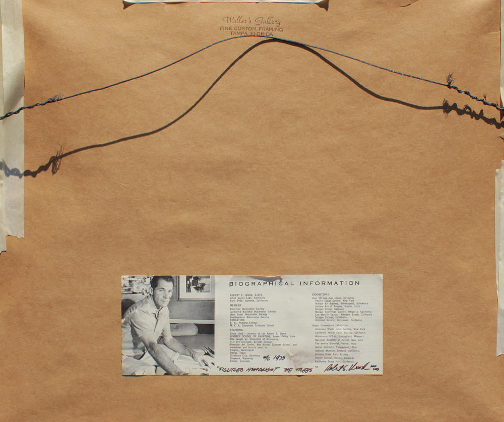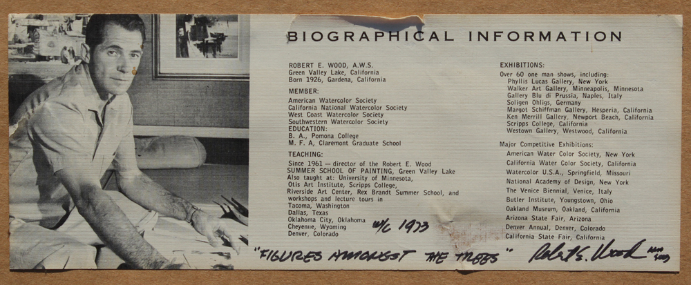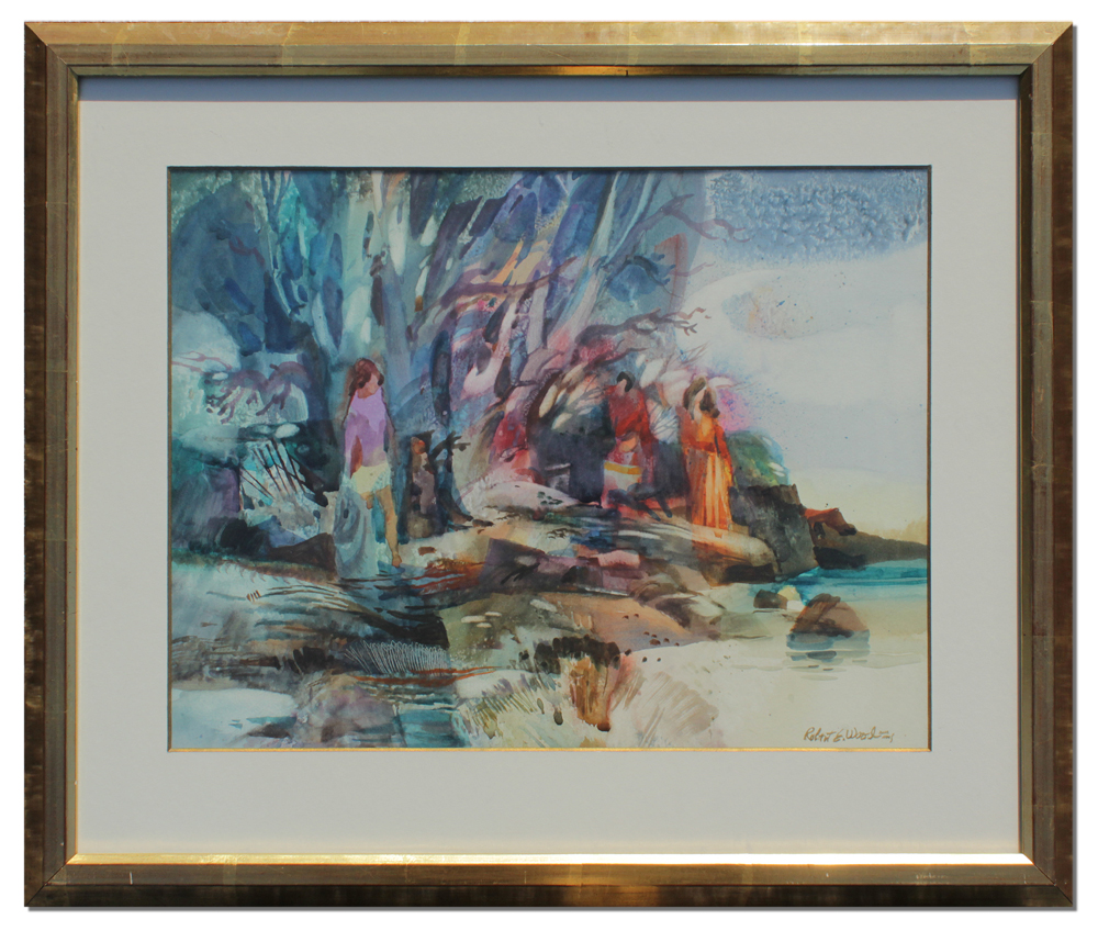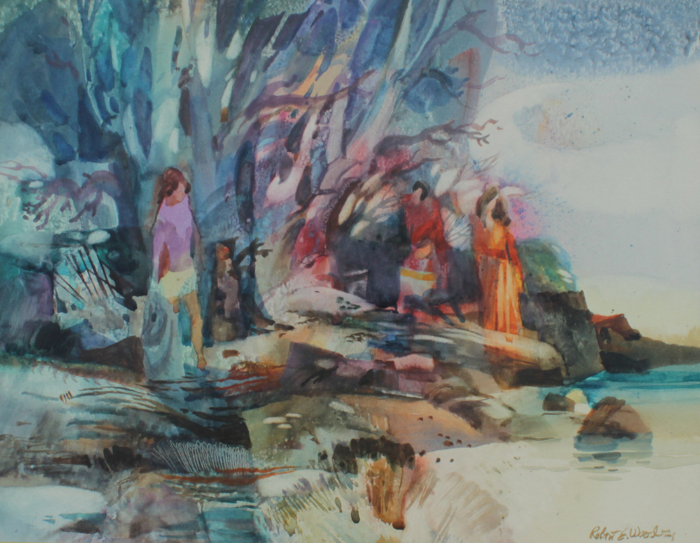 WOOD, Robert E., (American, 1926-1999): ''Figures Amongst the Trees'', Watercolor, sight size 10 1/2'' x 13 1/2'', signed lower right, framed, 16 1/2'' x 19 1/2''. Original receipt from Trailside Galleries, 1973, for $200. Nodine Collection.