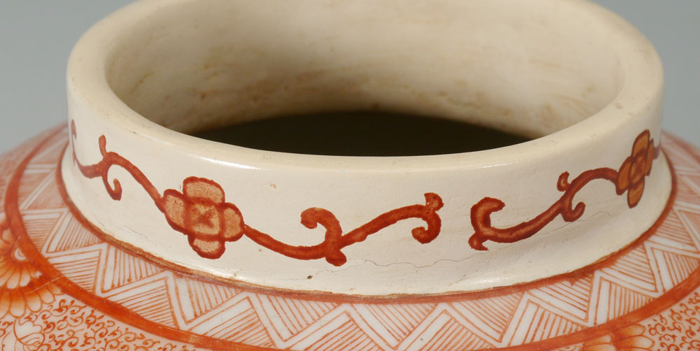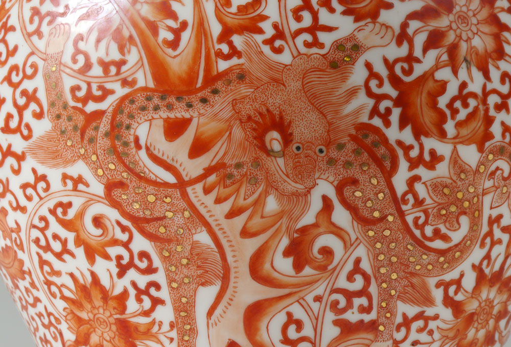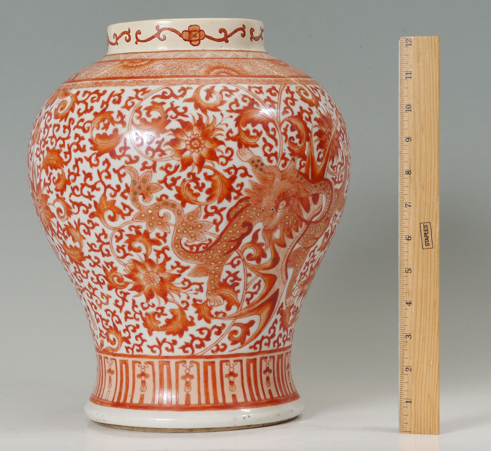 CHINESE RED DECORATED DRAGON VASE: Baluster form vase, decorated with dragon and foliate motifs, spurious Kangxi reign marks on base. Overall measures 13'' h. x 10''.