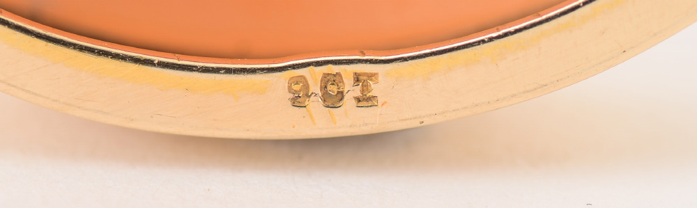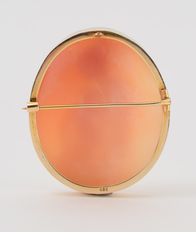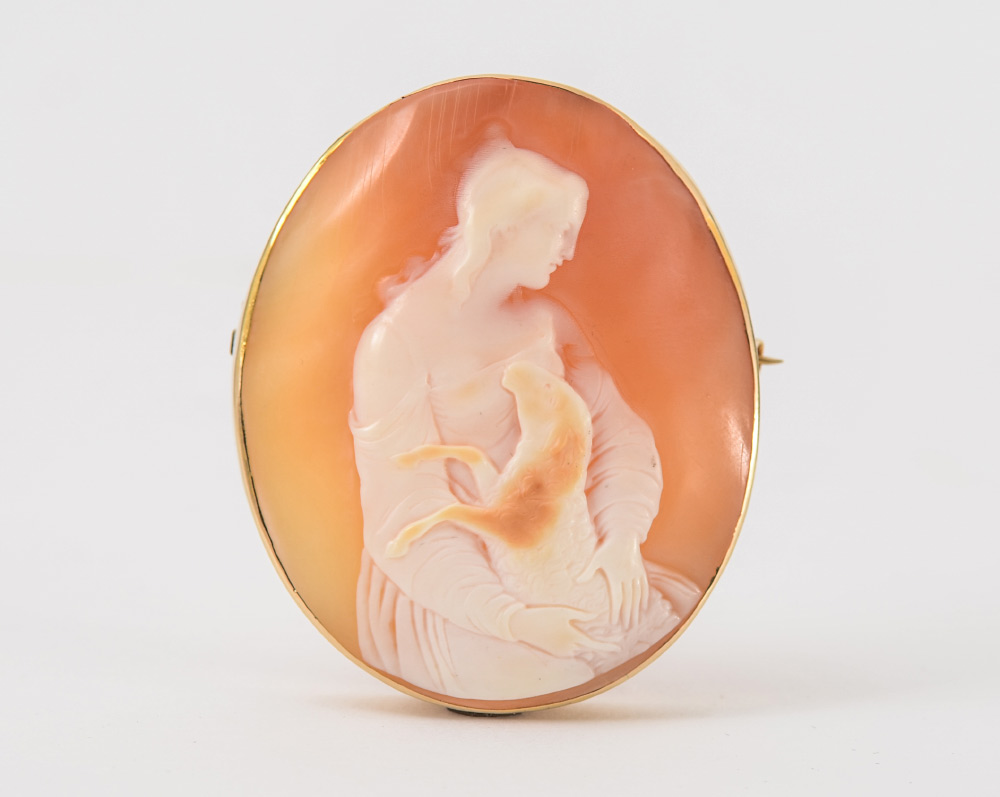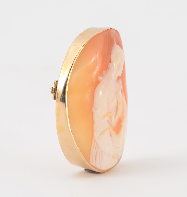 A LARGE CAMEO BROOCH PENDANT: 9 Ct yellow gold framed carved shell cameo depicting a woman and lamb. Measures approx. 2'' x 1 3/4''.