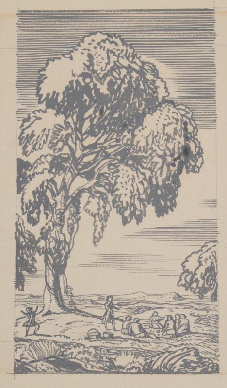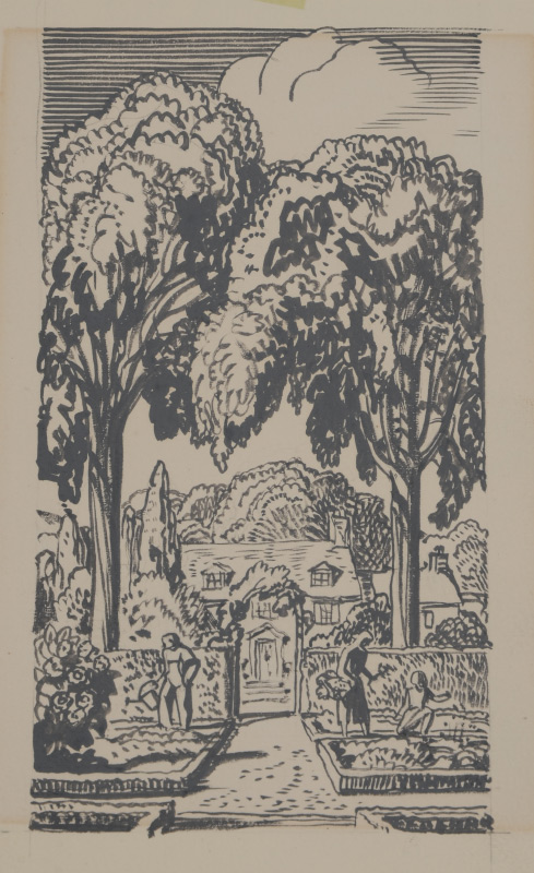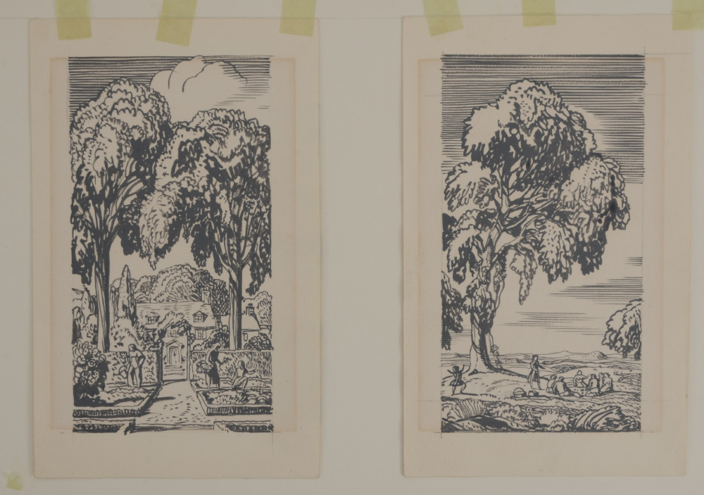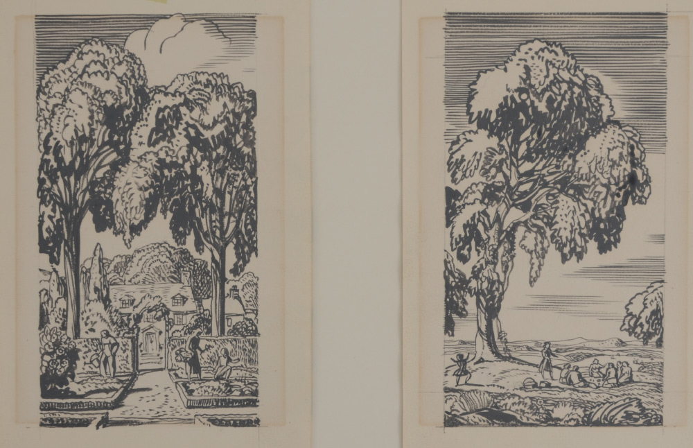 KENT, Rockwell, (American, 1882-1971): 2 original pencil and watercolor drawings, one depicting a picnic in a clearing, the other, a courtyard garden, both measure 6'' x 3 1/4'', stamped verso, ''These original drawings remain the property of Rockwell Kent, Ausable Forks, NY, and must be returned to him'', matted and hinge mounted, framed, 13 1/2'' x 19''.