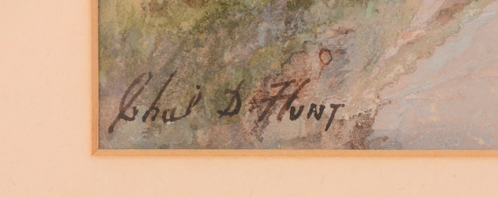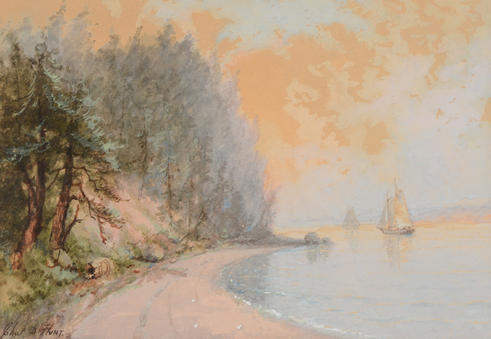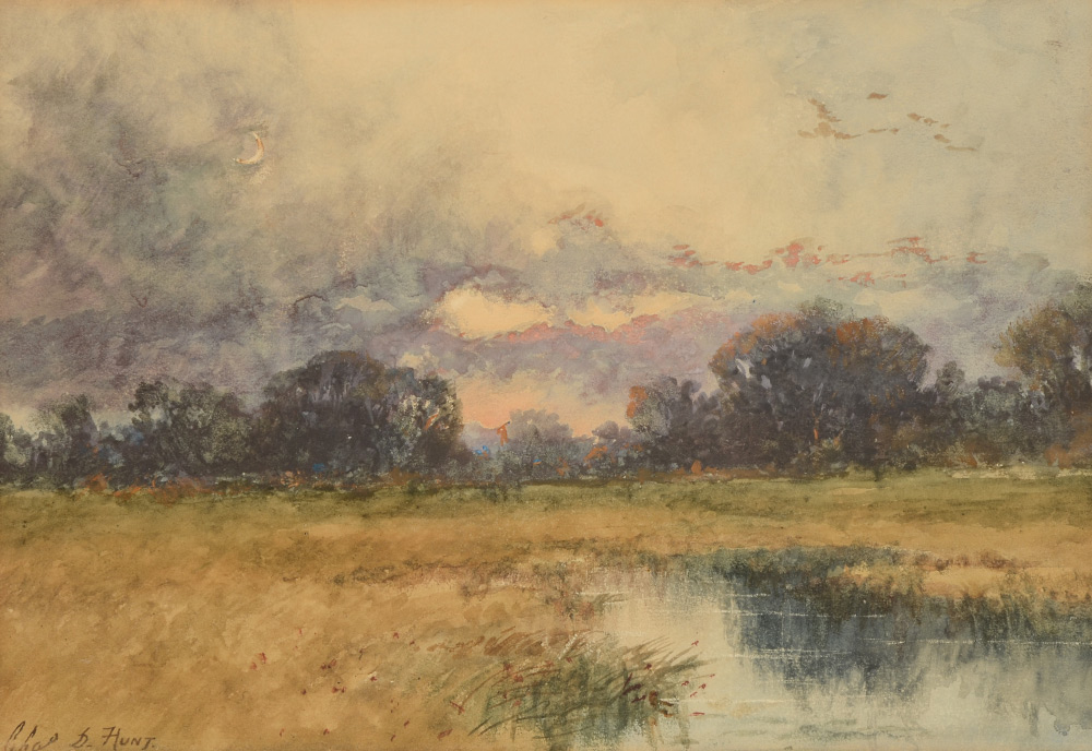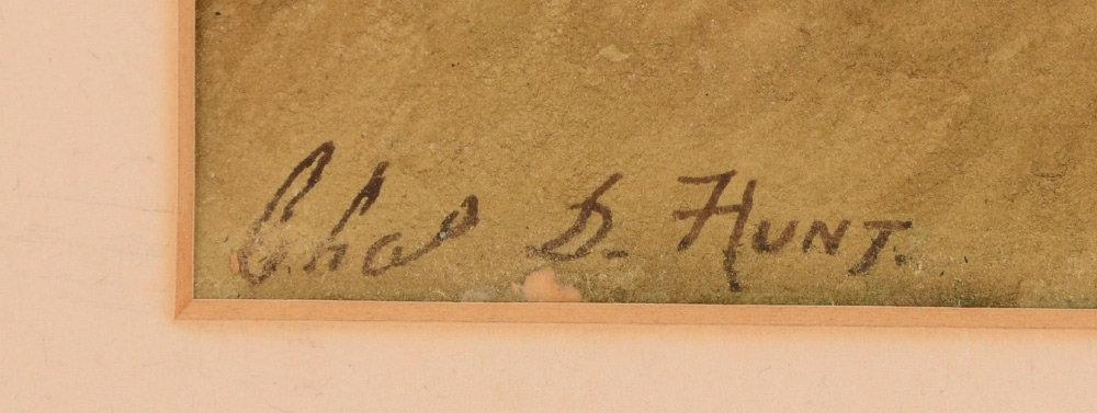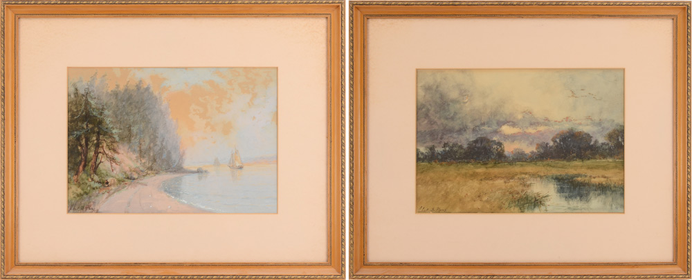 2 CHARLES D HUNT LANDSCAPE PAINTINGS HUNT, Charles, (American, 1840-1914): 2 Scenes, 1) Coastal Scene, sight size 9 3/4'' x 14'', signed lower right, framed, 18 1/2'' x 23'', 2) Pastoral Meadow Landscape, 9 3/4'' x 14'', signed lower right, framed, 15'' x 22''.