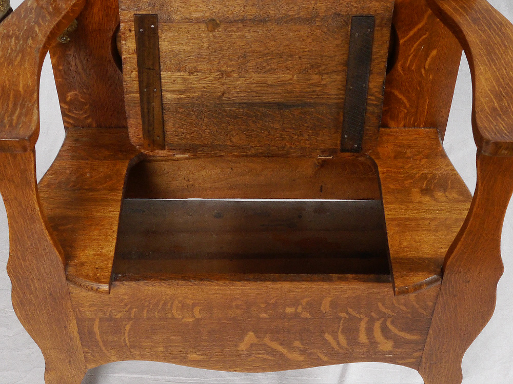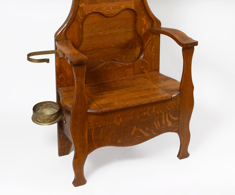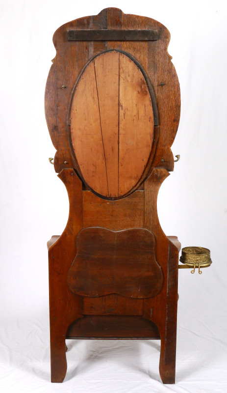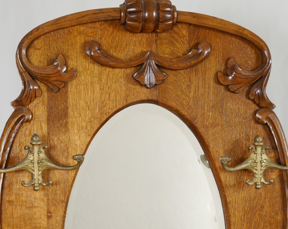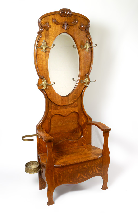 GOLDEN OAK HALL TREE WITH SEAT: Shaped top with applied carved decoration, beveled glass mirror, 4 double hooks, seat with lift top storage. 81'' h. x 31 1/2'' x 16''.