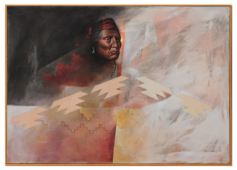 JOHNS, David, (American, 1948- ): Surreal Composition with Indian Chief as Focal Point, Oil/Canvas, 30'' x 42'', signed lower right, framed, 31'' x 43.