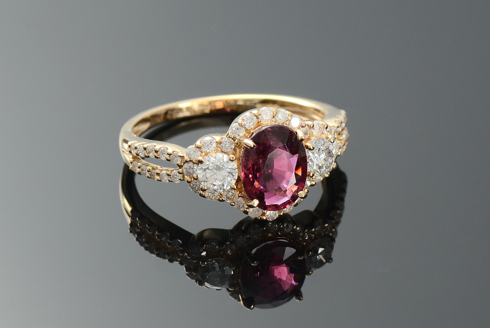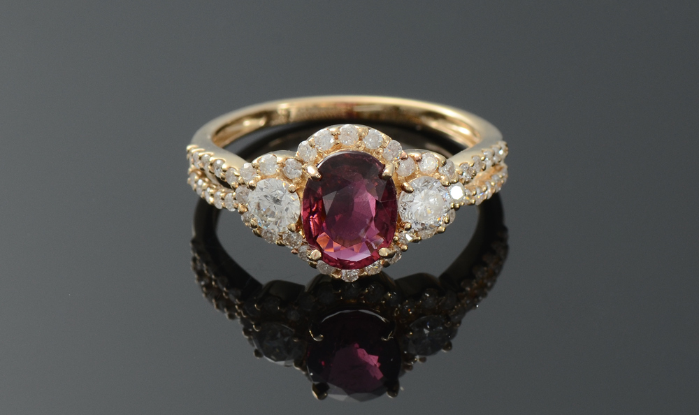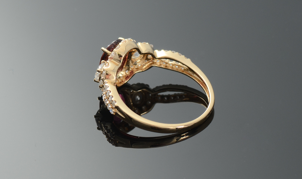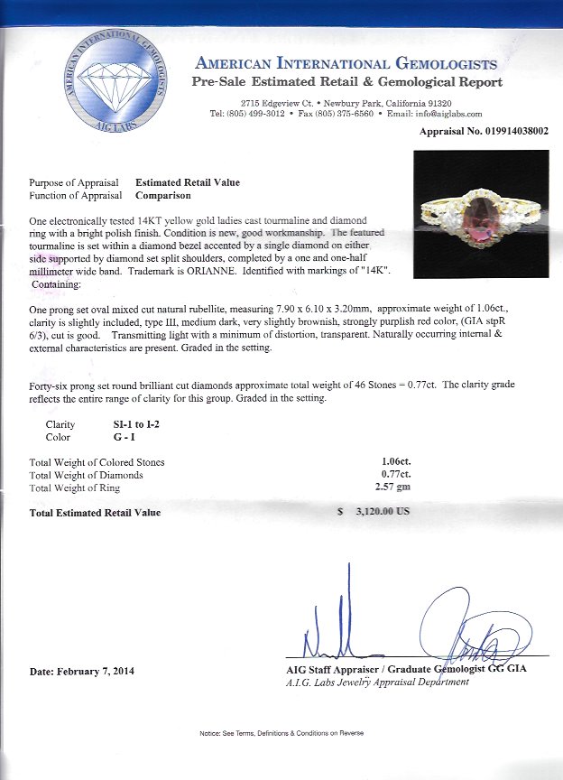 ORIANNE RUBELLITE TOURMALINE RING WITH DIAMONDS: 14K yellow gold ring centering an oval mixed cut natural tourmaline, approx. 1.06 Ct., set within a diamond bezel flanked by a single diamonds supported by diamond set split shoulders. The 46 diamonds total approx. .77 Ct., averaging SI1-I2 clarity and G-I color. Signed Orianne. Size 7. Weight 2.57 grams. Sold with AIG GIA graduate gemologist appraisal for $3120.
