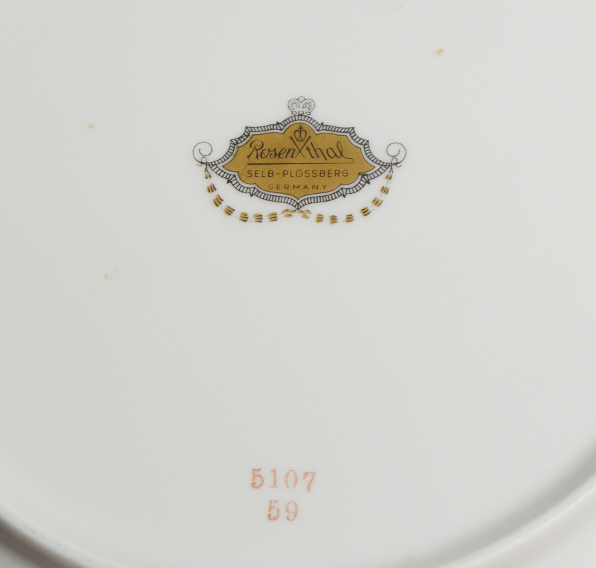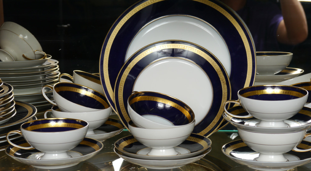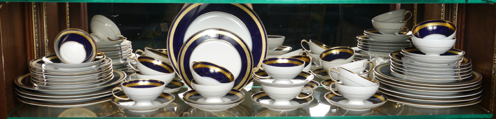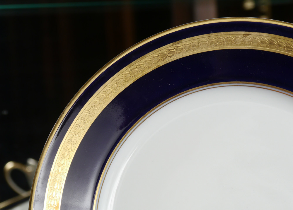 ROSENTHAL COBALT & GOLD TRIM CHINA: Approx. 51 pieces by Rosenthal with cobalt and embossed gilt rim to include 11 dinner plates (10 3/4''), 12 luncheon plates (7 3/4''), 16 teacup and 12 saucers (6'').