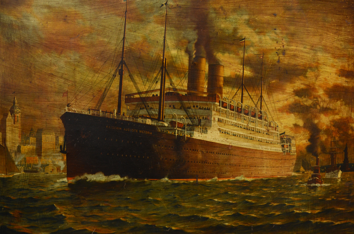 HAMBURG-AMERICAN SHIP TIN LITHOGRAPH SIGN: Tin lithograph sign of the ocean liner ''SS Kaiserin Auguste Victoria'', later renamed ''RMS Empress of Scotland'' original by Fred Parsing. The ship was originally a transatlantic passenger vessel, for the Hamburg American Lines, later used to transport American troops home from WWI, then sold to Canadian Pacific, scrapped in 1933. Tin measures 29 1/2'' x 42''.