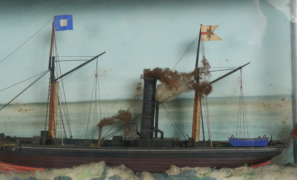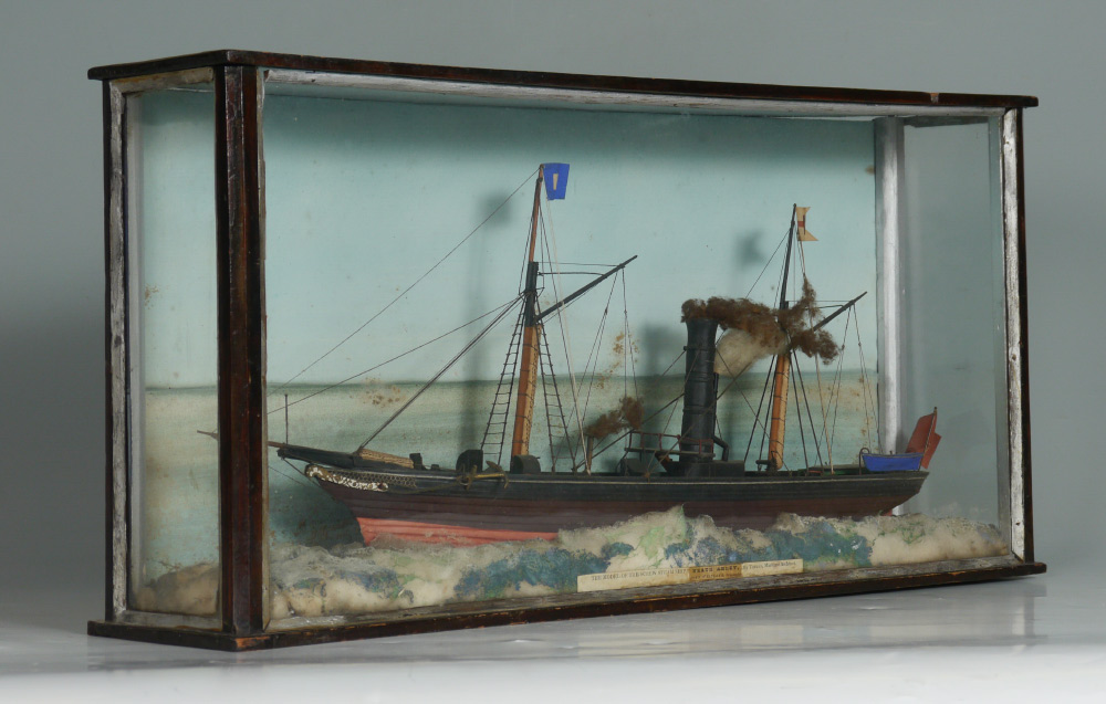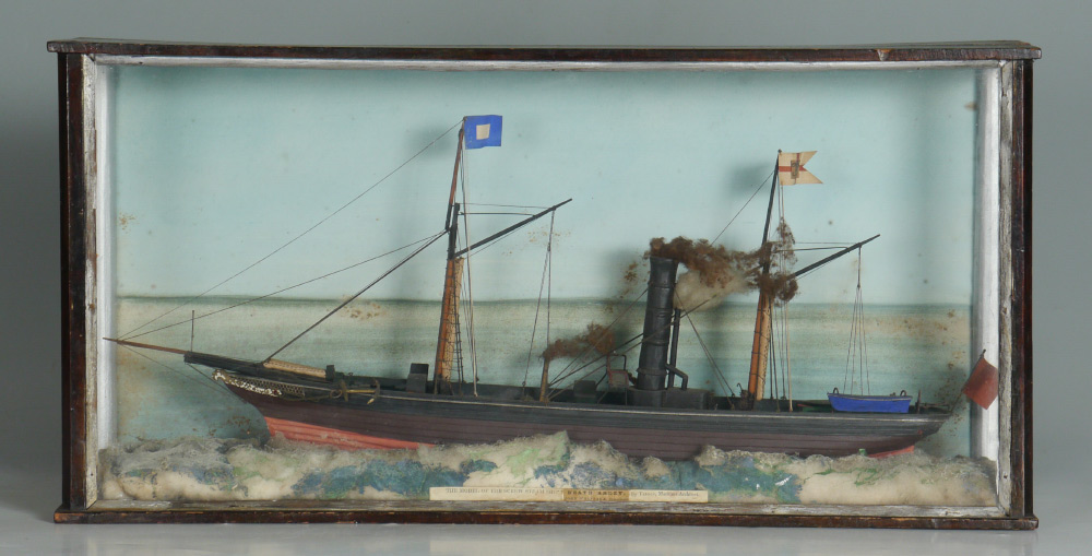 TRIGGS SHIP DIORAMA OF STEAMSHIP HEATH ABBEY: Victorian model of the screw steamship ''Heath Abbey'' by maritime architect Triggs encased in shadowbox diorama with painted background and cotton waves. Overall measures 12 1/2'' h. x 25 1/2'' x 5 1/4''.