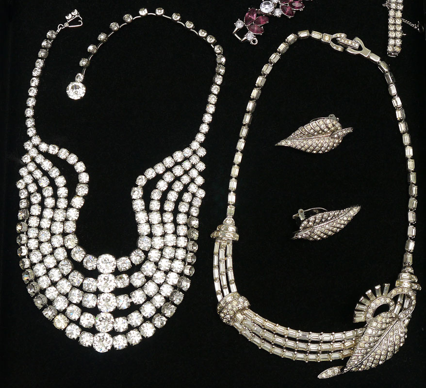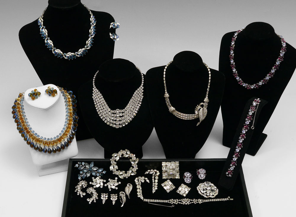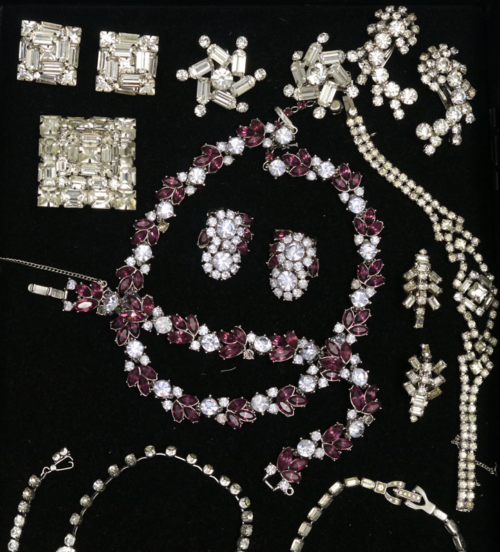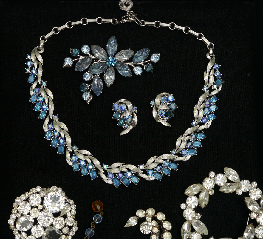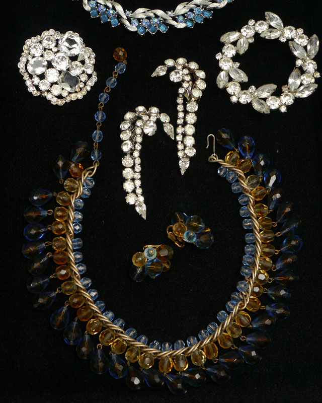 VINTAGE SIGNED COSTUME JEWELRY: Penino necklace and earrings set, Carnegie blue and amber color necklace and earrings set, Weiss brooch and earring set, Kramer NY, Trifari suite, and Lisner.