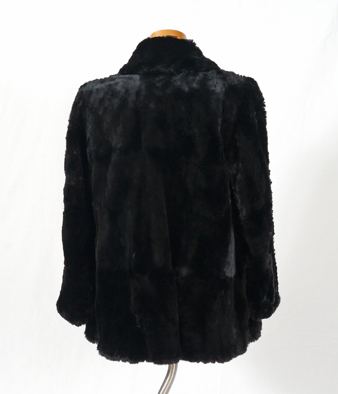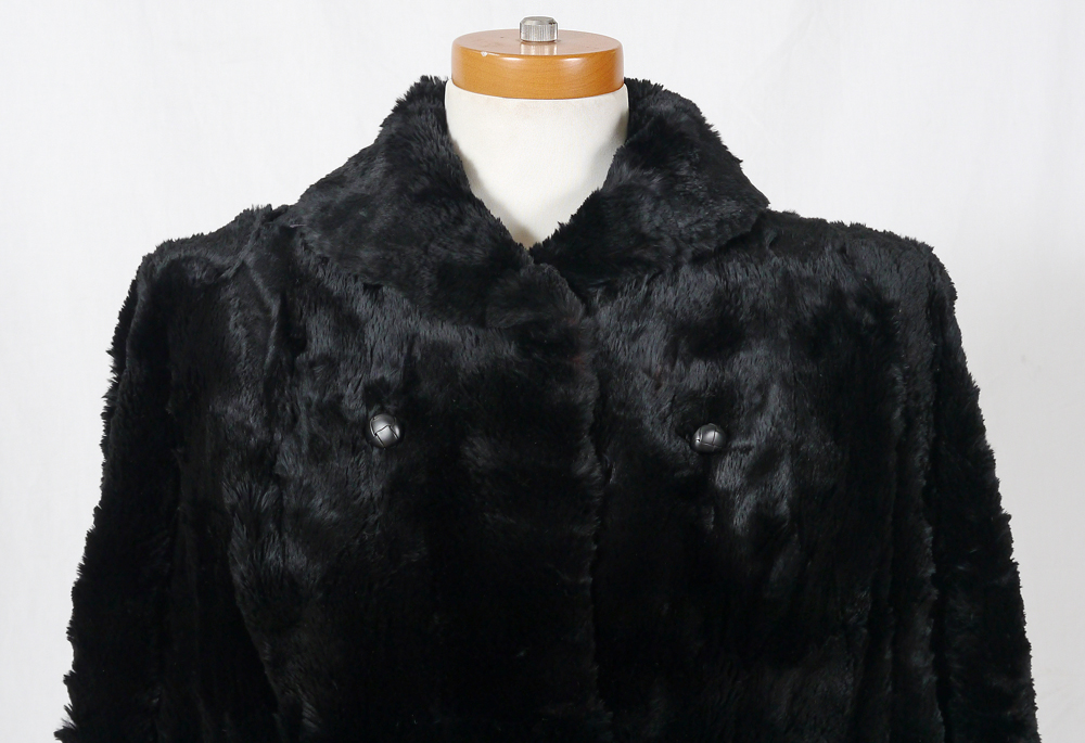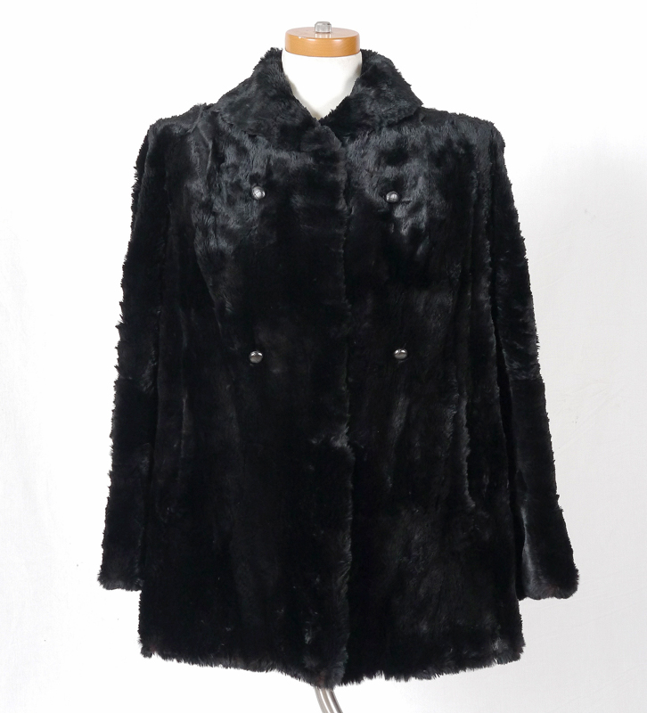 VINTAGE BLACK FUR JACKET: Car coat length in a dark dense fur, straight sleeves, decorative buttons, clasp front. Measures approx. 29'' collar to hem, 22'' shoulder to cuff, and 18'' shoulder to shoulder.