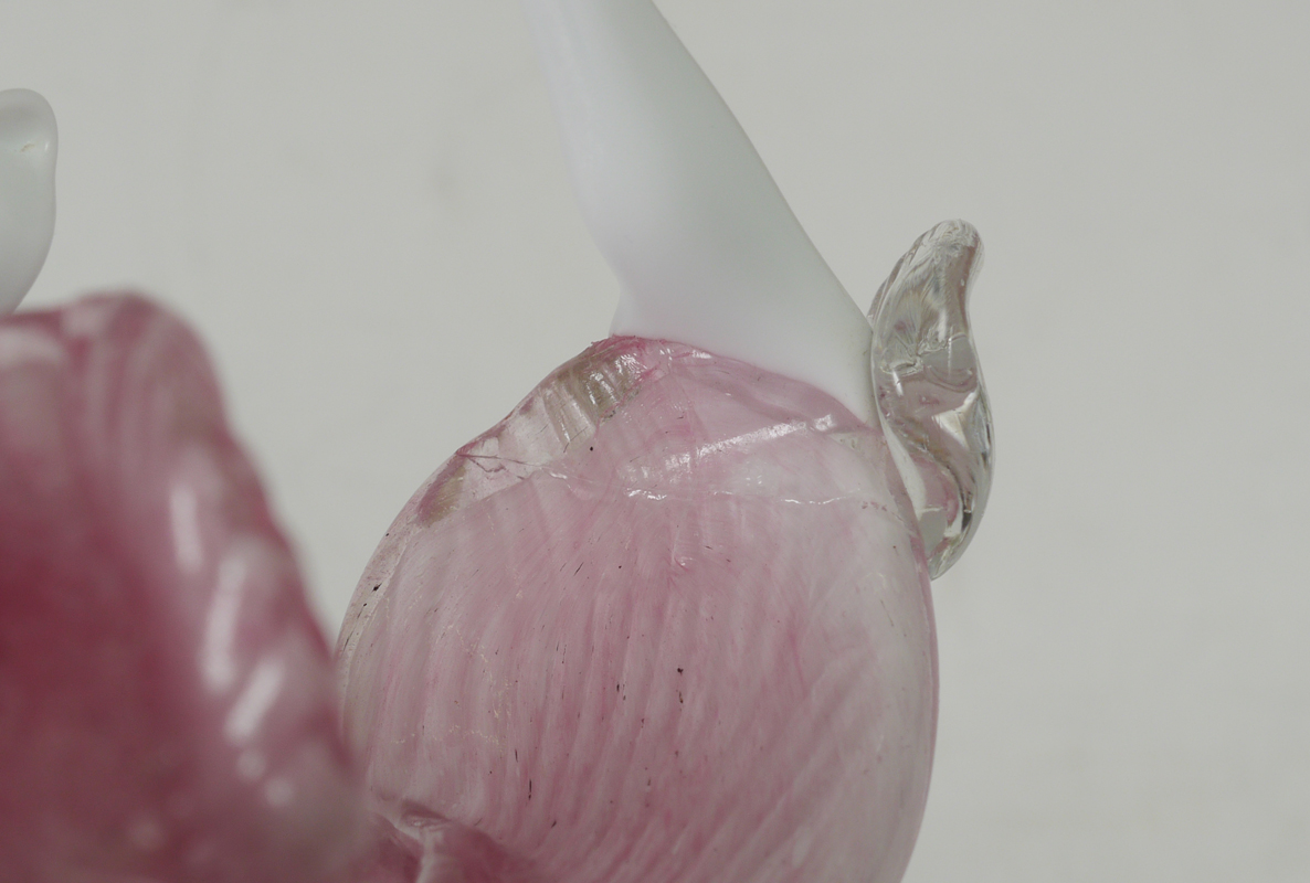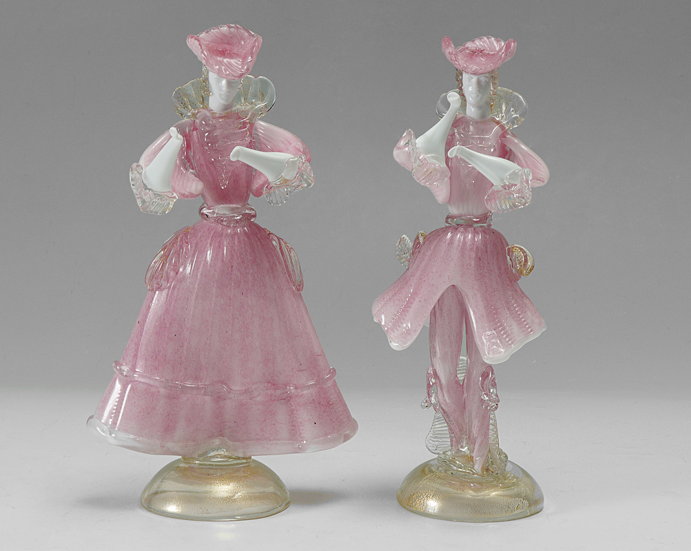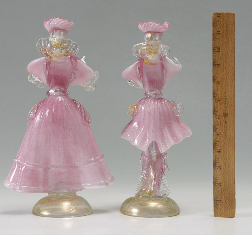 PAIR MURANO GLASS DANCER FIGURINES: Mottled pink, white, and clear glass figures of a couple dancing with aventurine bases. No visible mark or label, taller measures 11 3/4'' h. x 6 3/4'' x 5 3/4''.