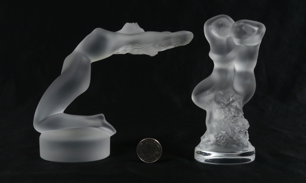 2 PIECE LALIQUE CRYSTAL NUDE PAPERWEIGHTS: 2 pieces to include 1) ''Chrysis'', etched signature, 5 1/4'' h. x 9 1/2'' x 2 3/4''. 2) Double ''Faune'', etched signature and original label 5 1/2'' h. x 2 1/2''.