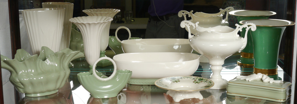 GREEN LENOX ESTATE COLLECTION: 9 piece assembled collection green and white Lenox to include vases, centerpieces, urn, covered box and more. Tallest vase measures 10'' h.