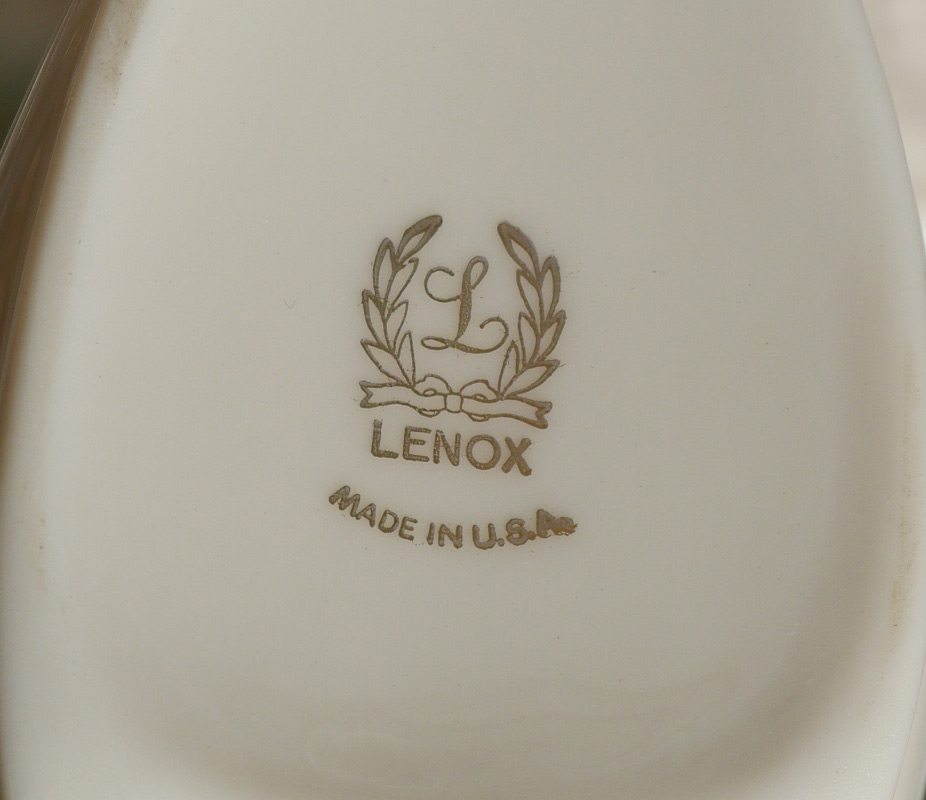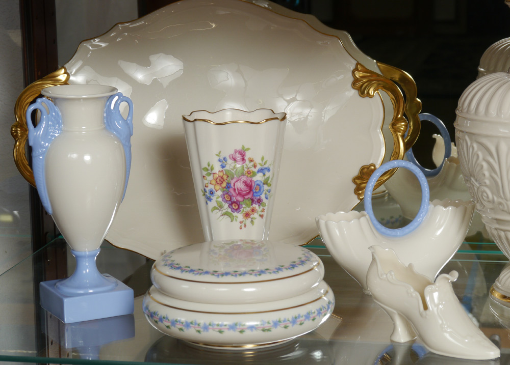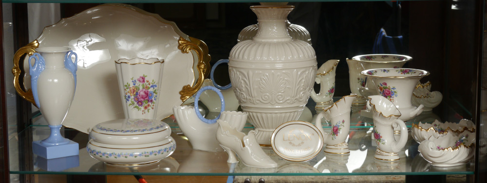 BLUE & LENOX ROSE LENOX ESTATE COLLECTION: 9 piece assembled collection in blue & white and Lenox Rose to include vases, gilt handled serving dish, covered dresser jar, shoe and more. Tallest vase 11 1/2'' x 7 1/4''.