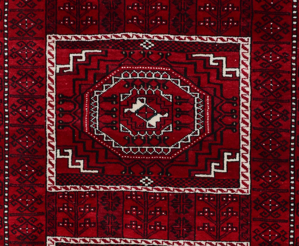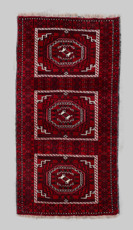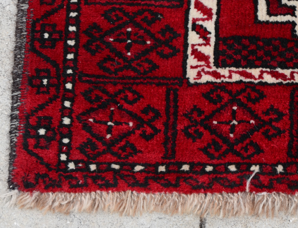 APPROX 20-30 YR OLD AFGHAN BOKHARA HAND KNOTTED WOOL RUG, 4'1'' x 7'3'': This vibrant rug is predominately red with black outlines of various motifs. There are three large white outlines of medallions within medallions that make up the central design of the rug. Despite the few colors that are used in this rug, there is still a lot going on in terms of the motifs in blacks and white. Condition is good.