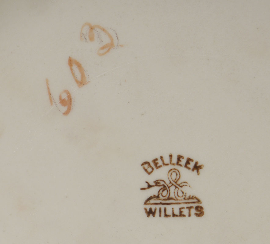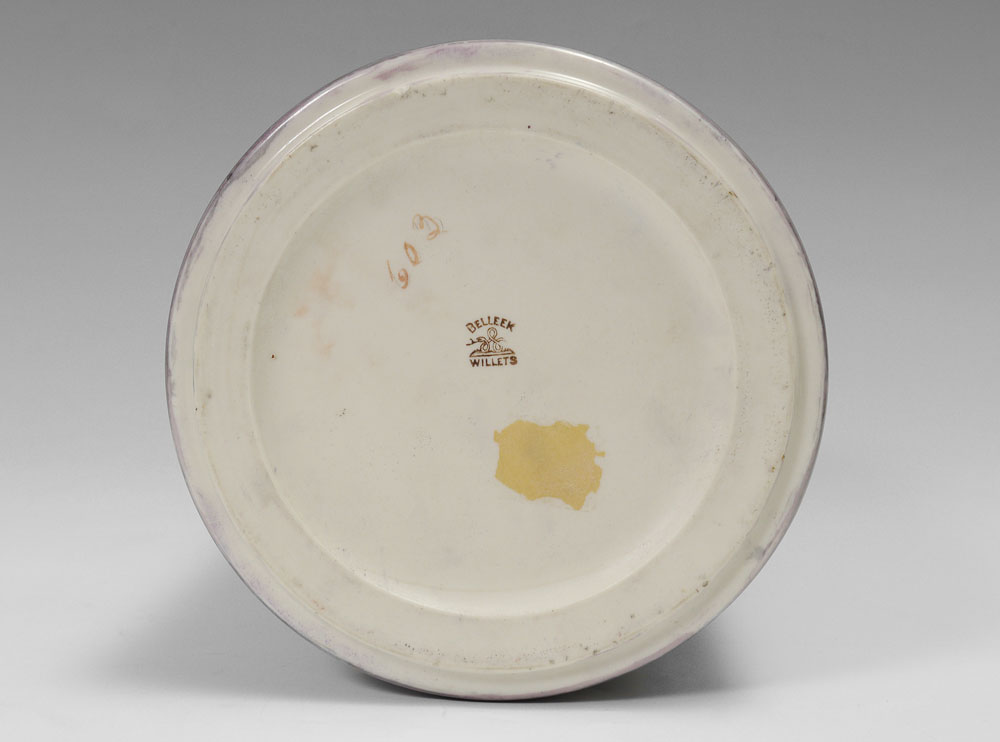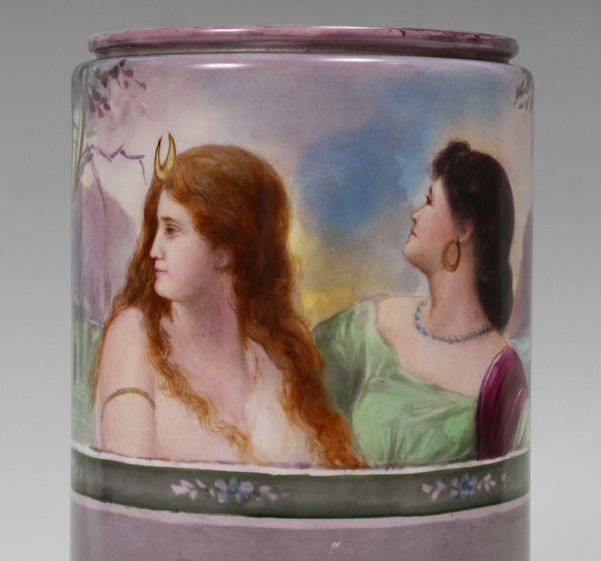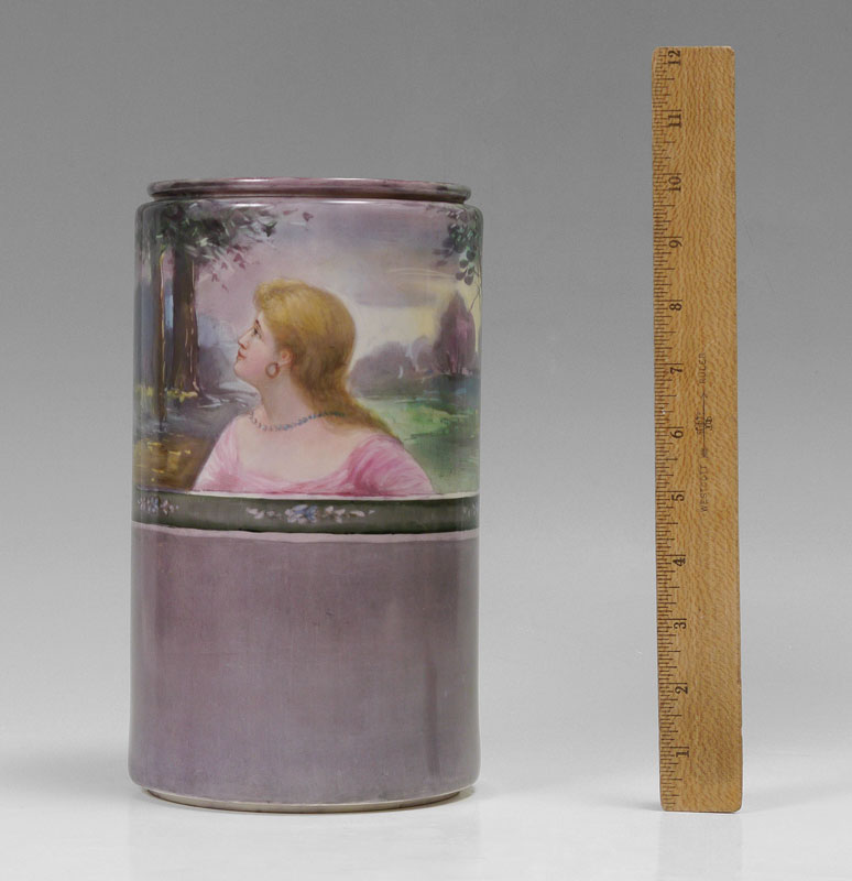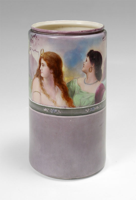 WILLETS BELLEEK HAND PAINTED VASE: Circa 1879-1909, cylindrical form vase, top half hand painted with scene of 3 maiden's busts in landscape over floral border over purple/grey ground. No visible signature, marked on base with brown mark, number 603. Overall measures 10'' x 5 1/2''