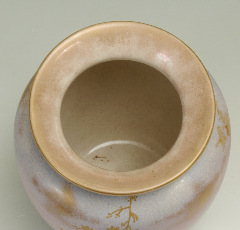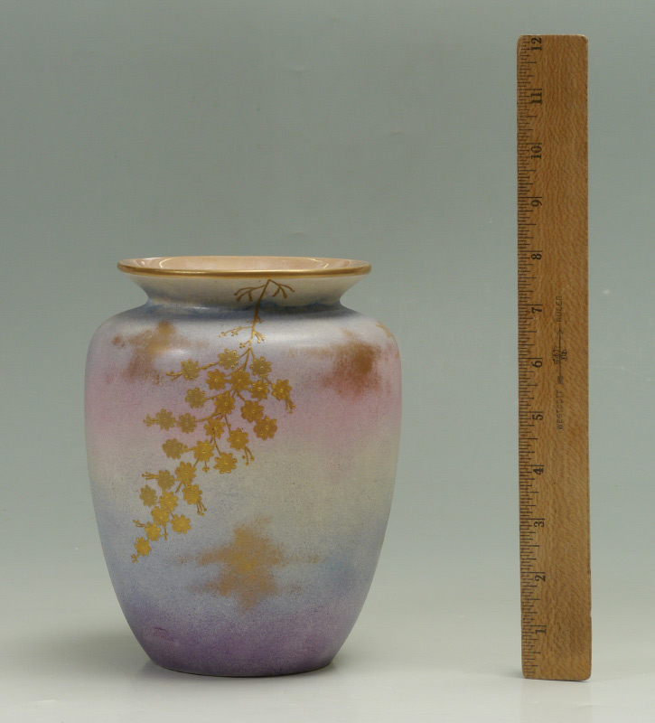 MAYER & MARSH AMERICAN BELLEEK PORCELAIN VASE: Gilt botanicals over mottled pastel ground. Measures approx. 8'' tall.