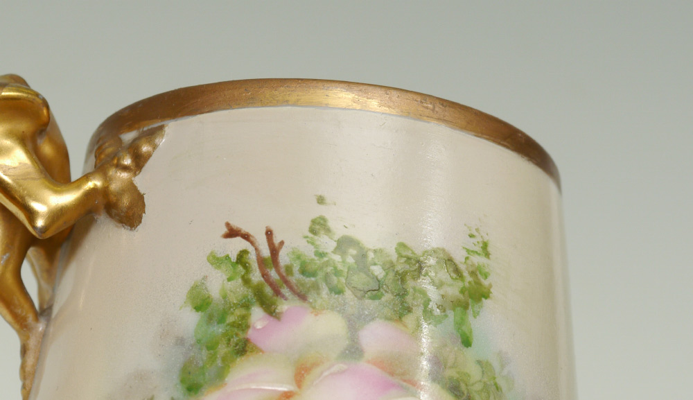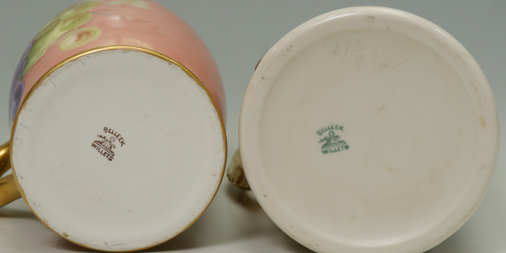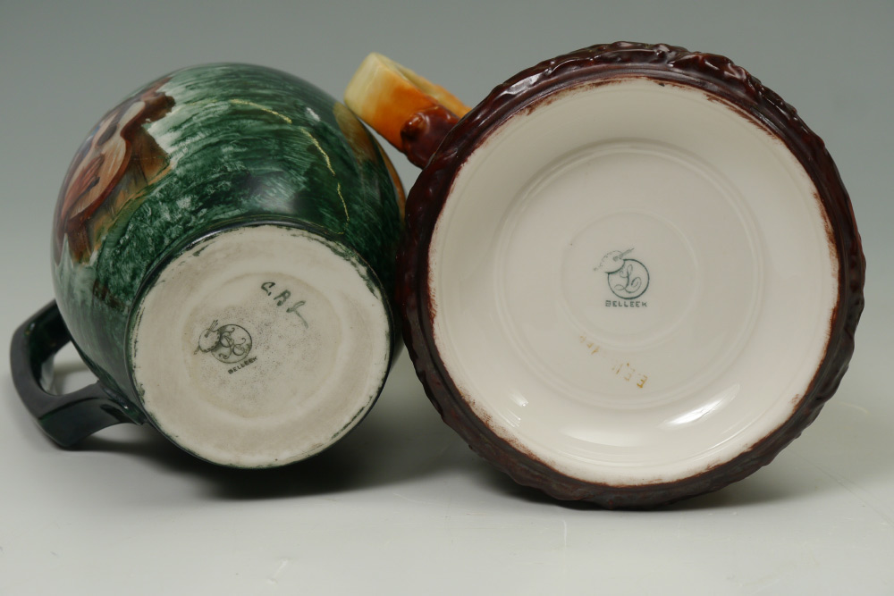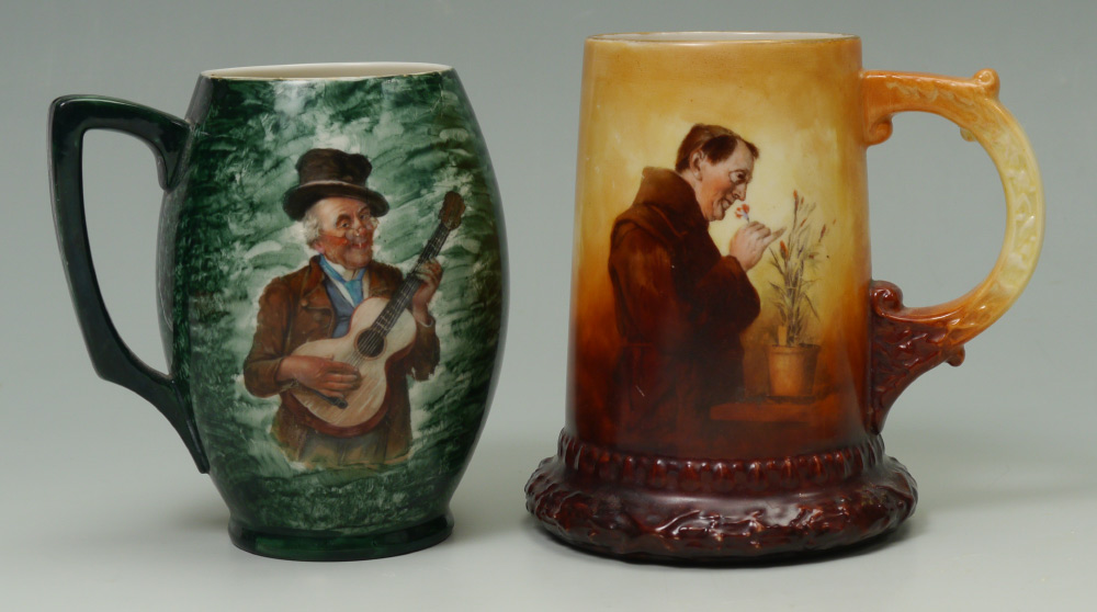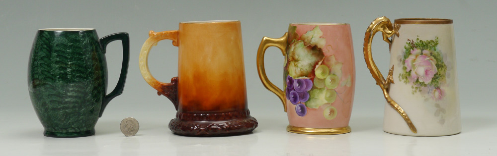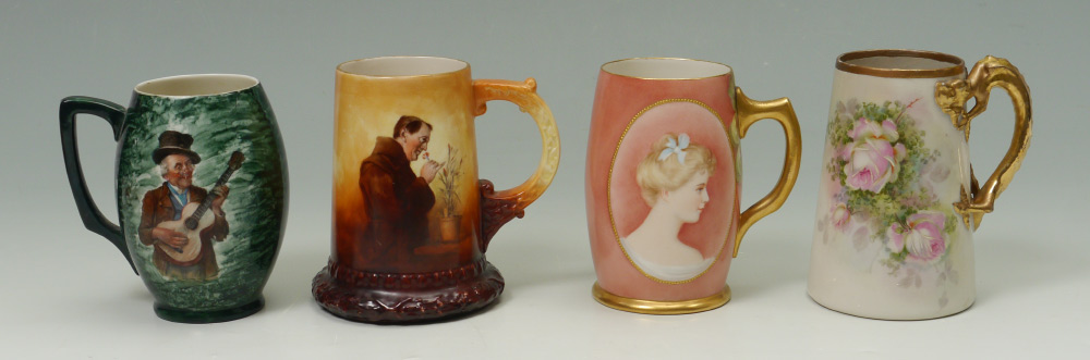 GROUP OF 4 AMERICAN BELLEEK AND PAINTED PORCELAIN MUGS: 1) Willits grape and portrait design. 2) Lenox Belleek Monk. 3) Willets roses with dragon handle. 4) Ceramic Arts Musician. All measure approx. 6''.