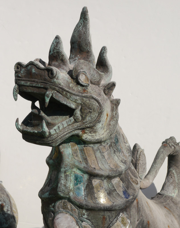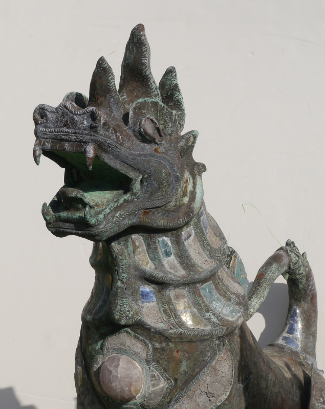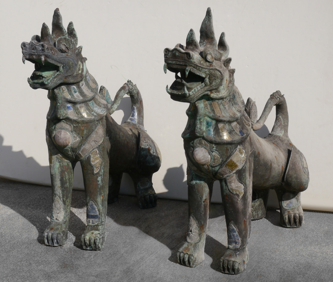 PAIR LARGE BRONZE TIBETAN TEMPLE DOGS: Similar crouching pair, each made of bronze with inset applied stone and mica accents. Most likely 20th century, 33 1/2'' h. x 26 1/2'' x 12 3/4''. Sold with 2 concrete bases, 12'' h. x 20 3/4'' x 10 1/2''
