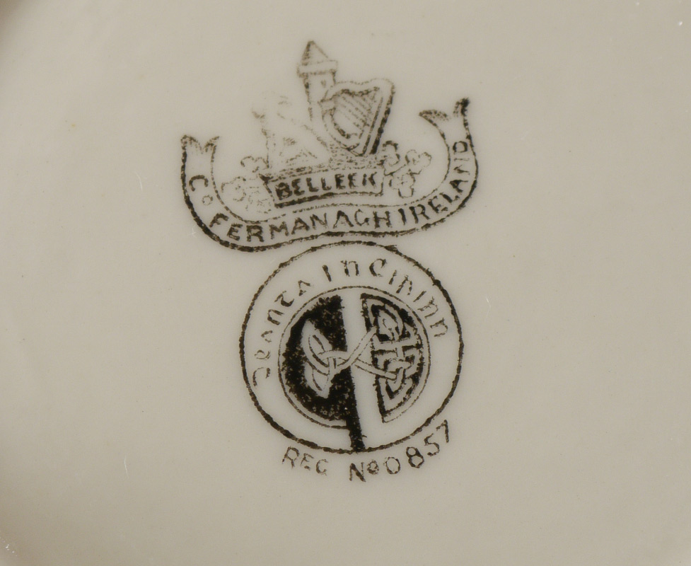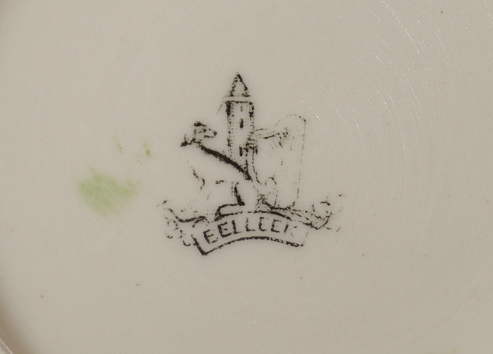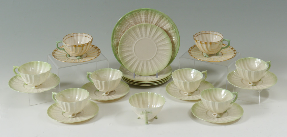 BELLEEK BLACK MARK NEPTUNE CUPS AND SAUCERS: 22 piece green tinted to include 2 hand painted decorated cups and saucers, 6 green rimmed cups and saucers (5 1/4''), extra cup, 4 larger saucers (6''), and an 8'' plate.