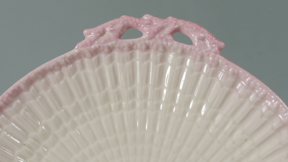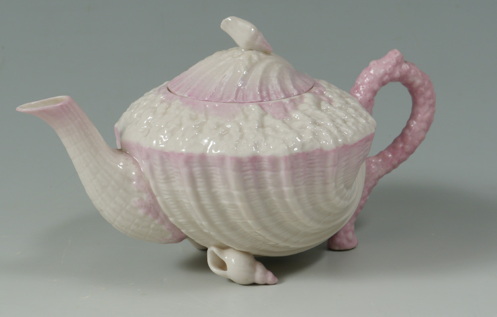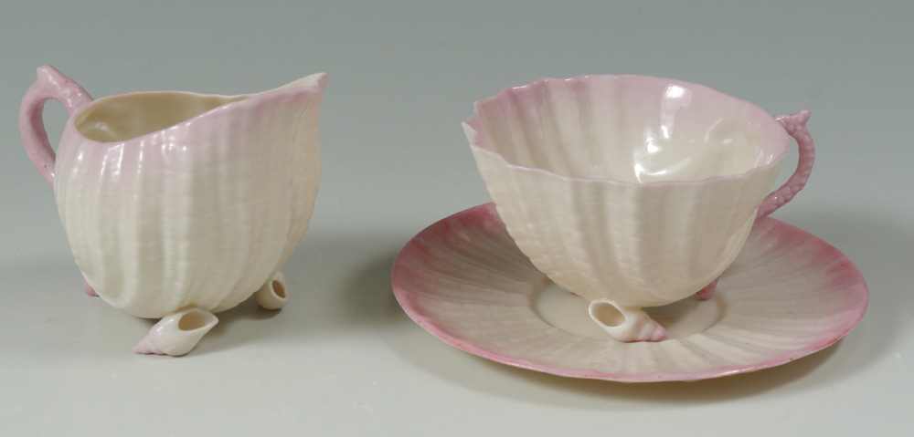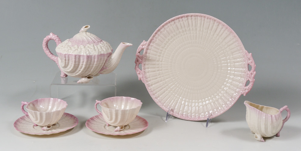 BELLEEK BLACK MARK NEPTUNE CUPS AND SAUCERS: 7 piece pink tinted to include teapot, 11'' cake plate, 2 cups and saucers, and a cream pitcher.