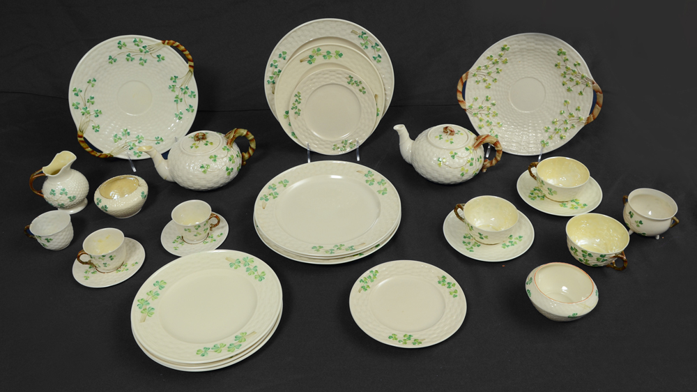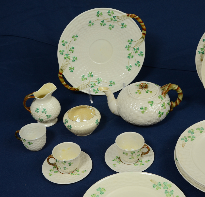 IRISH BELLEEK SHAMROCK PATTERN PORCELAIN: Approx. 28 pieces, all black mark. Includes 2 teapots, 2 bread or cake plates (10 1/4''), creamer, 2 sugar, tri pod kettle sugar, 3 demi cups, 2 saucers, 3 cups, 2 saucers, 4 dinner plates (9 1/2''), 4 plates (8''), and 2 plates (6 1/2'').