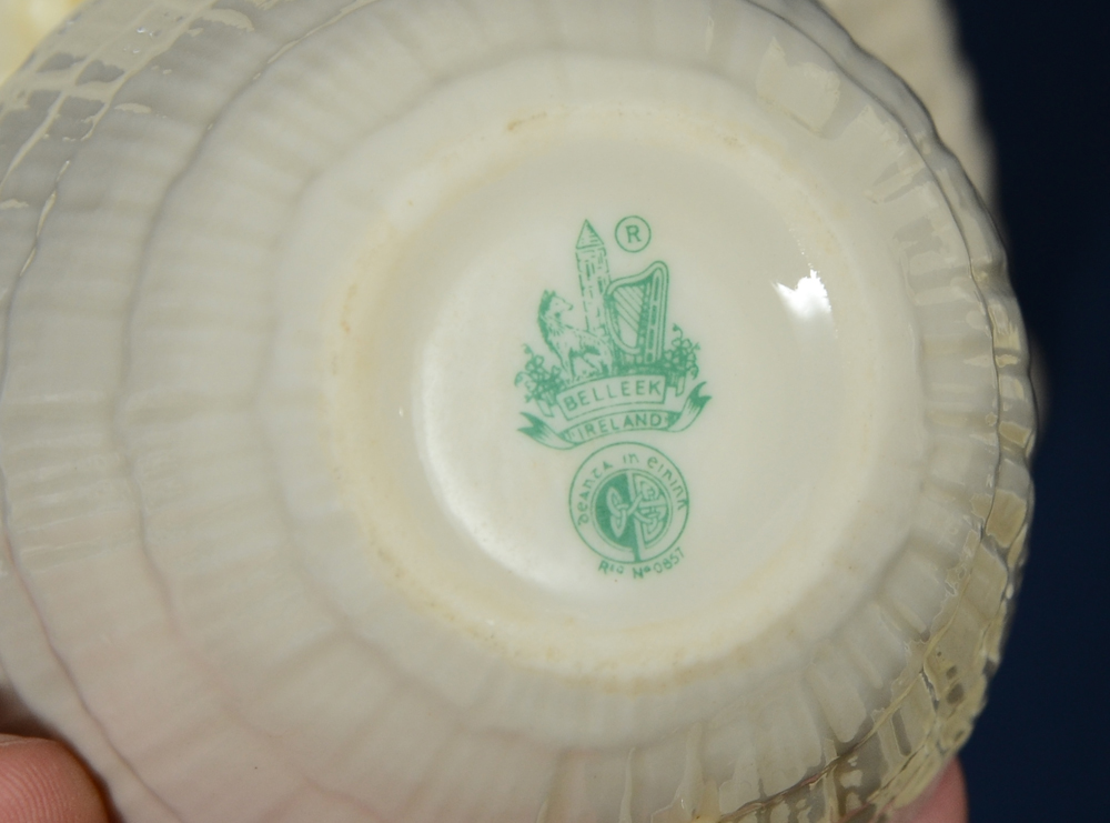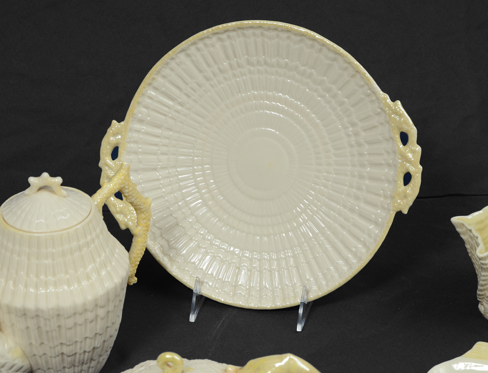 IRISH BELLEEK PORCELAIN LIMPET AND TRIDACNA: Limpet coffee pot, 2 bread or cake plates (11''), creamer, sugar and 6 snack trays with 5 cups. The teapot is Tridacna. All with green marks.