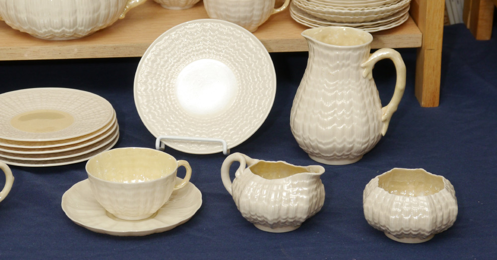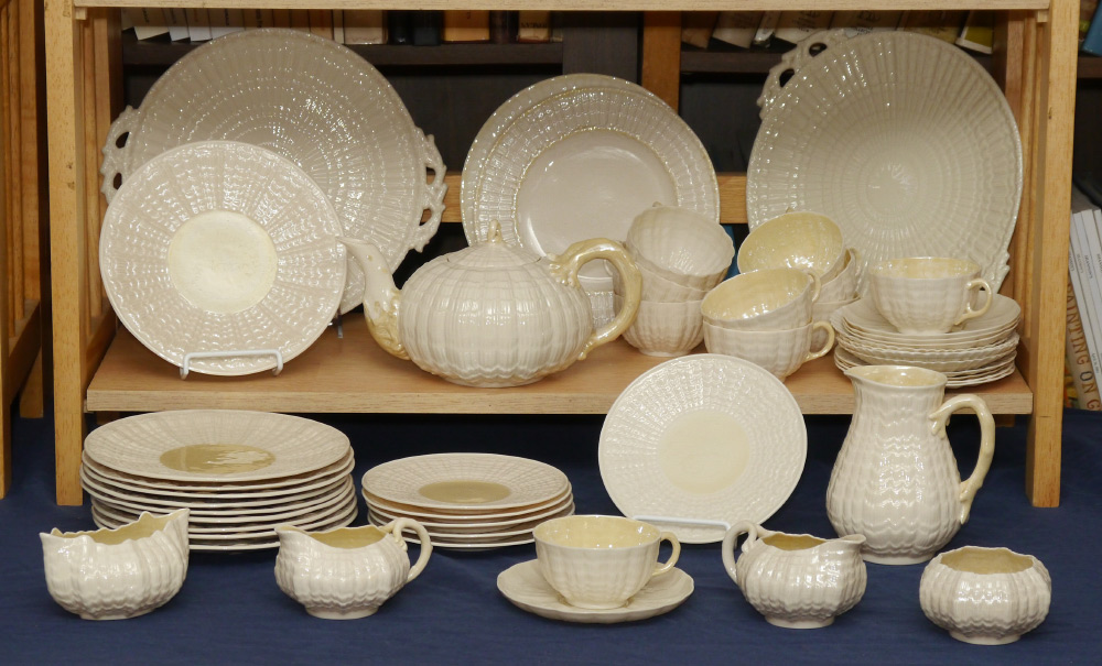 BELLEEK IRISH PORCELAIN: Approx. 46 pieces of Tridacna, Neptune and Limpet. Accumulated group to include Large teapot, 2 cake plates (11''), 6 plates (6''), 2 Neptune plates (8''), 10 cups, 10 saucers, jug (5 1/4''), boat shape cream and sugar, cream and sugar, and 10 plates (7 1/2''). Green mark.