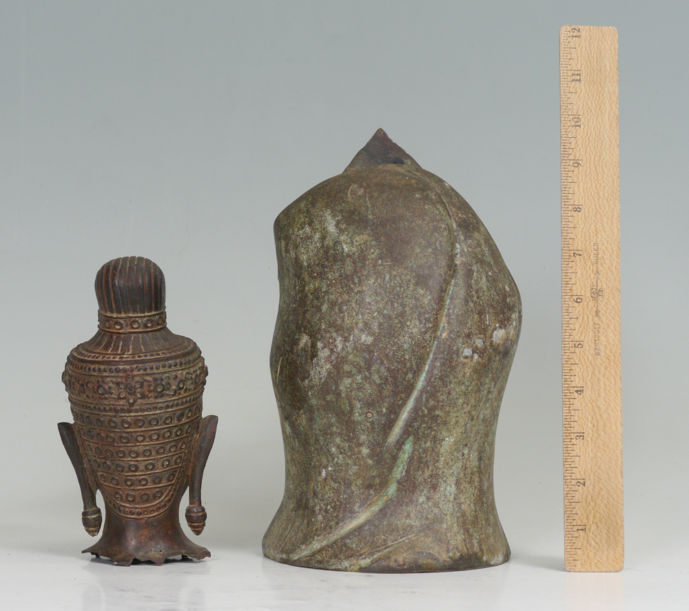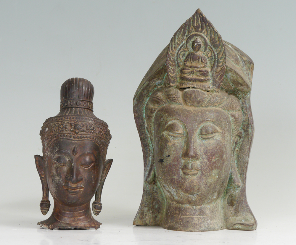 2 BRONZE SOUTHEAST ASIAN BUDDHA BUSTS: 2 pieces total, most likely Thai, to include 1) Figural bust with flowing hair, head band with figural seated Buddha, overall measures 10'' h. x 6'' x 5 1/2''. 2) Smaller bust with head band, hair in bun, stretched ears. 6 3/4'' h. x 3 3/4'' x 4''. Actual age unknown.