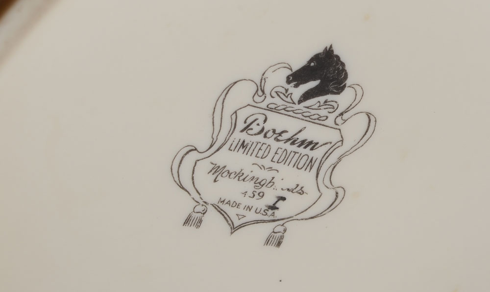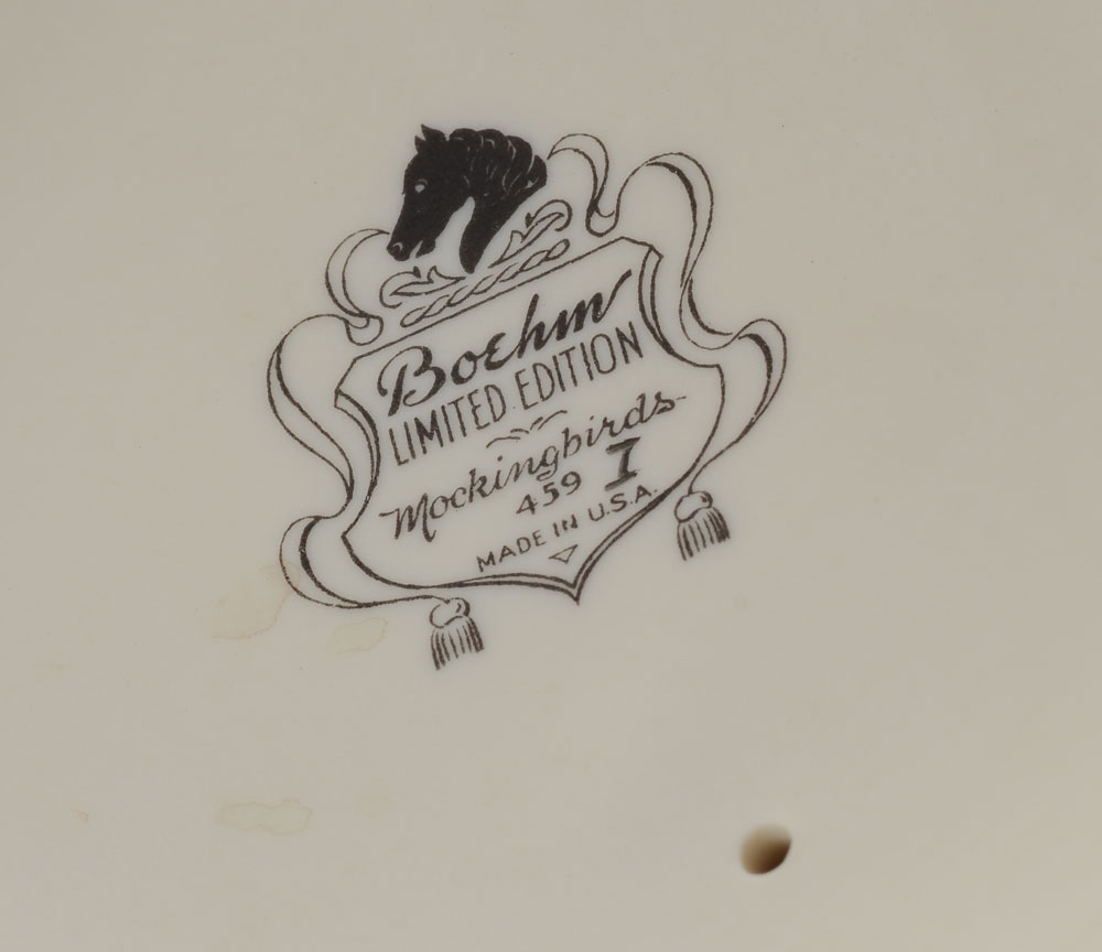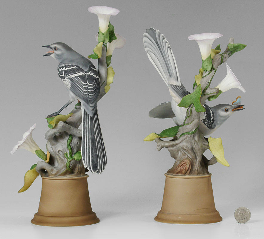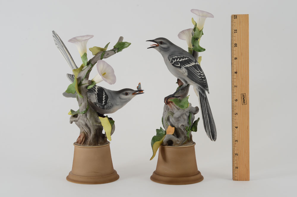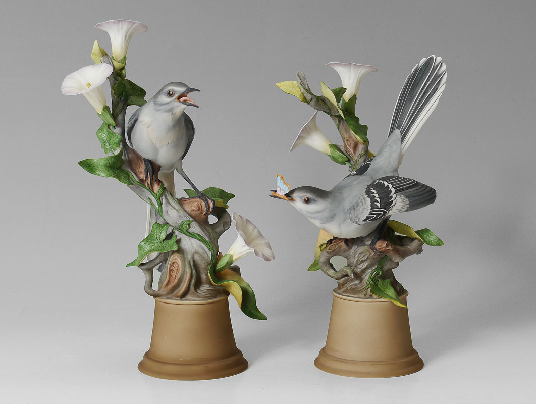 PAIR BOEHM PORCELAIN MOCKINGBIRDS 459: Made in USA, measures 11'' h. and 12 1/4'' h. x 7'' wide. Proceeds benefit the Clearwater Audubon Society.