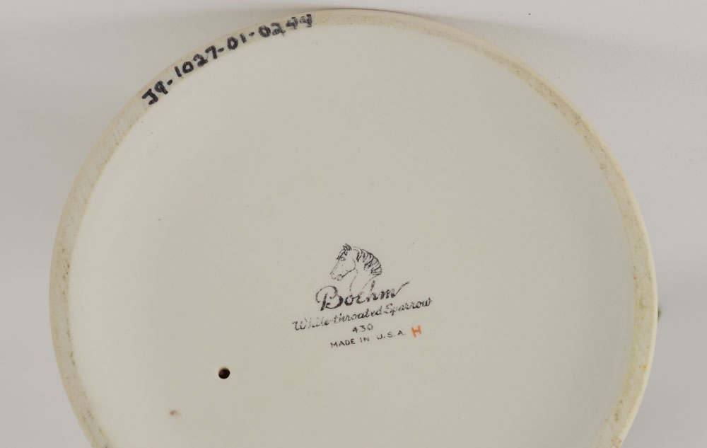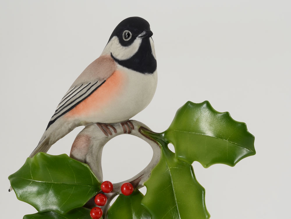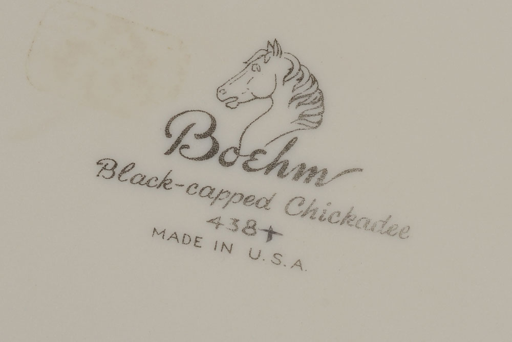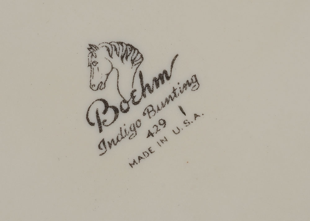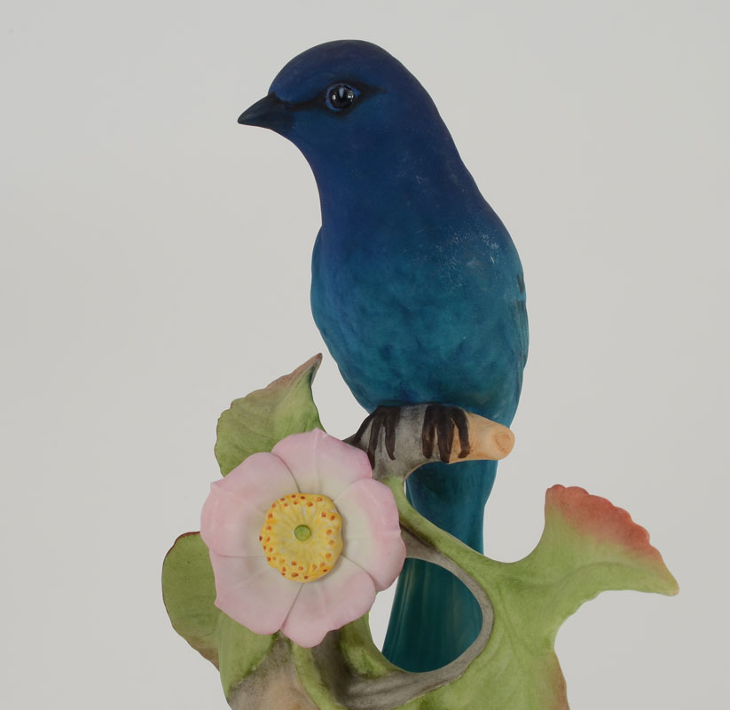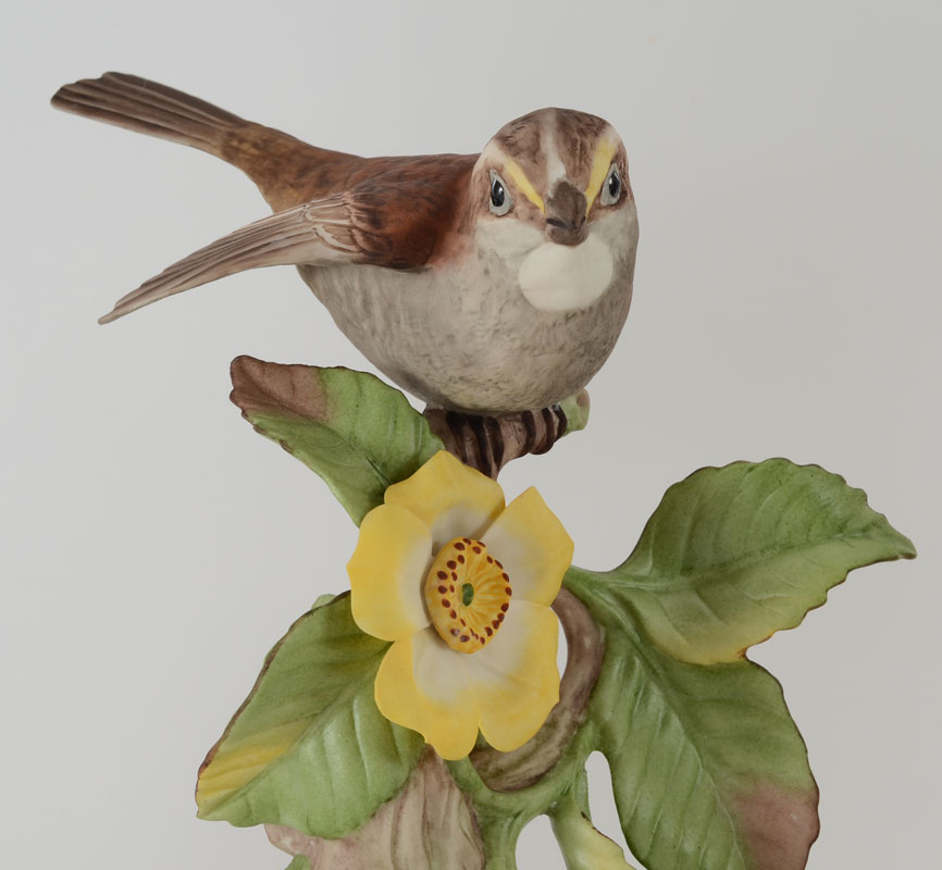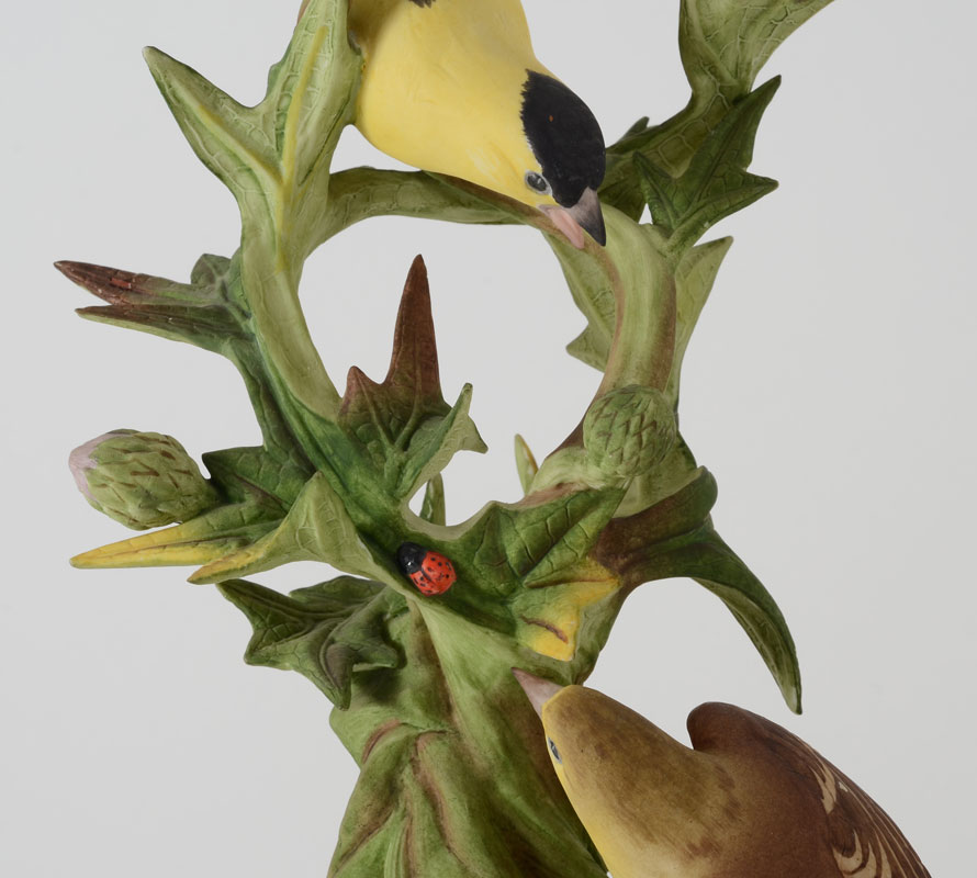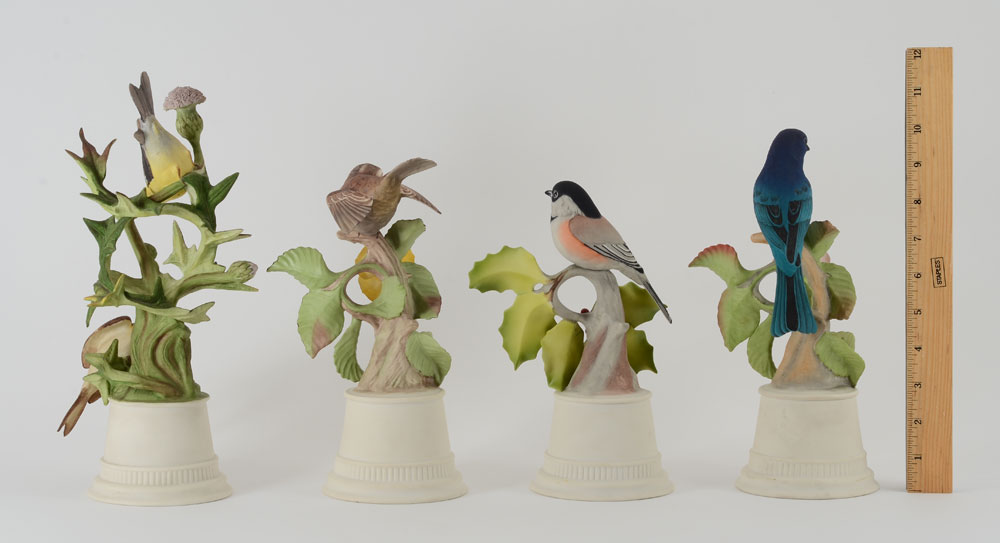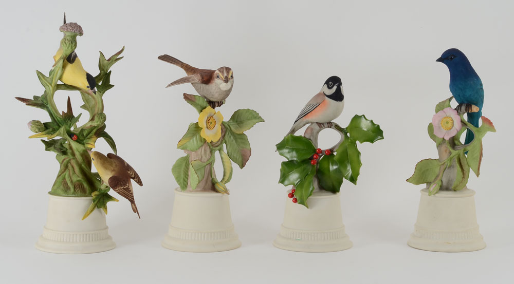 4 BOEHM PORCELAIN BIRDS: Indigo Bunting, Goldfinches, and White Throated Sparrow, and the Black Capped Chickadee. Measures approx. 9-11 1/2'' tall. Made in USA. Proceeds to benefit the Clearwater Audubon Society.