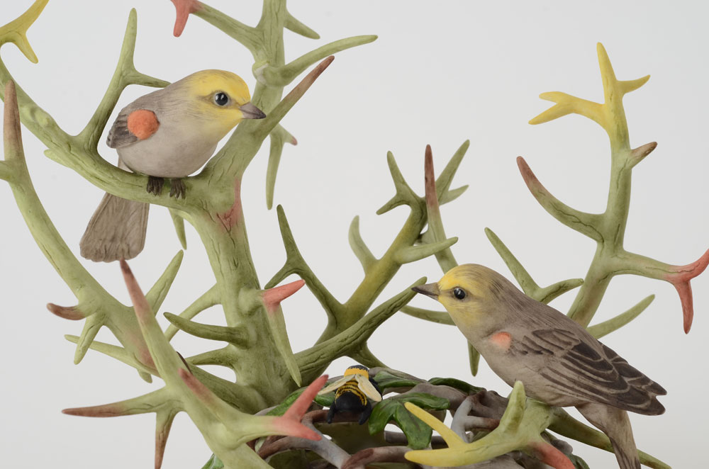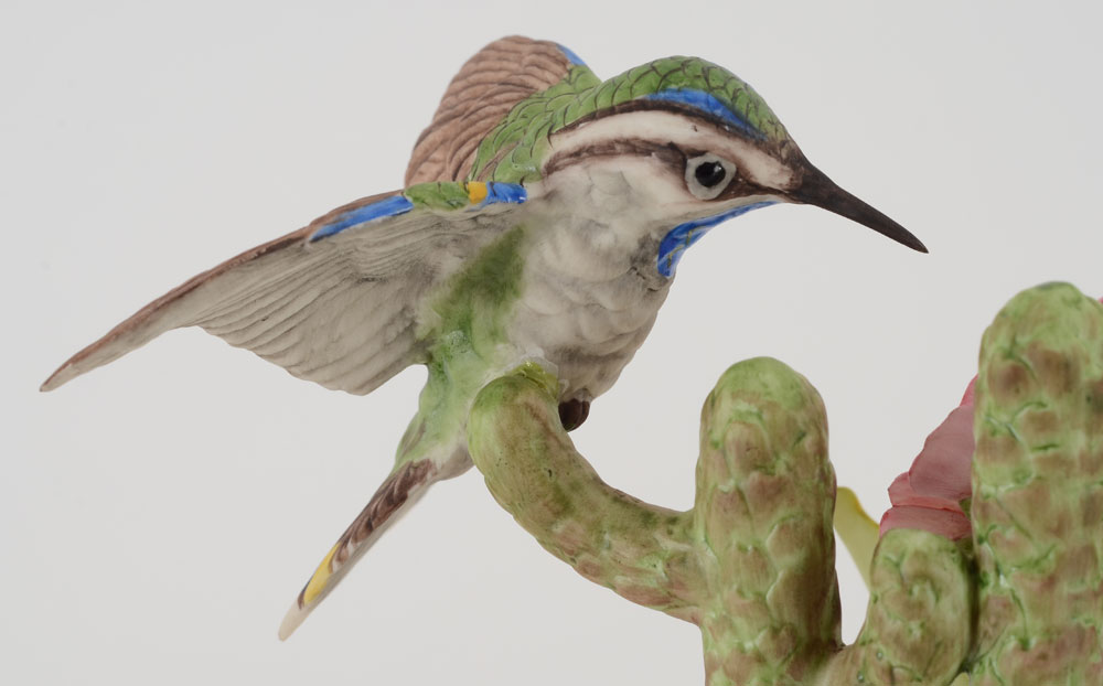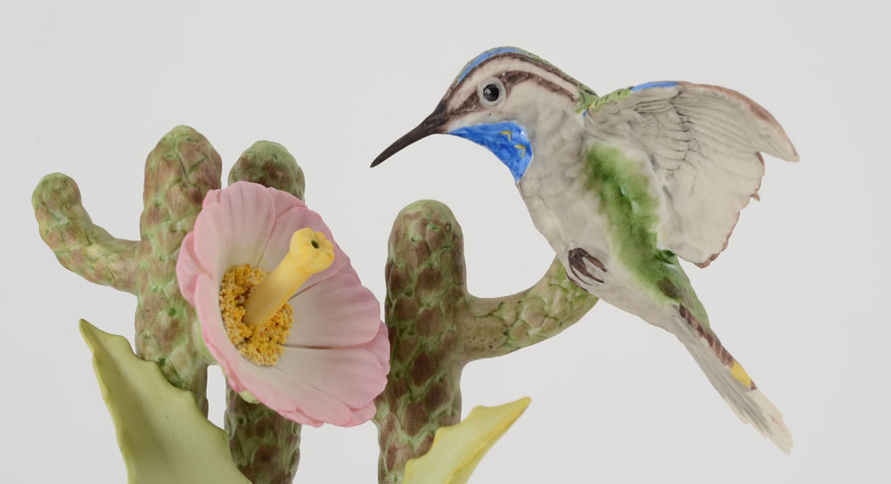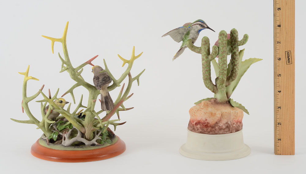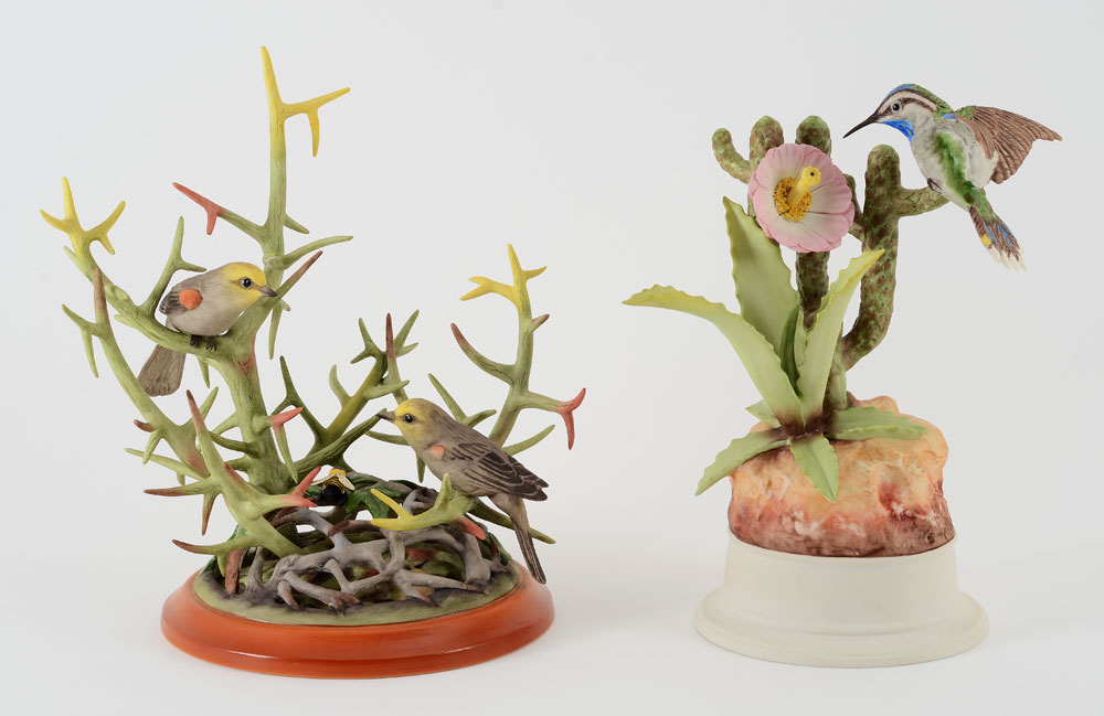 2 BOEHM PORCELAIN BIRD FIGURINES: 1) Hummingbird, 7 7/8'' x 7 1/4''. 2) Verdins, 8 3/4'' x 8''. Both are made in USA. Proceeds to benefit the Clearwater Audubon Society.