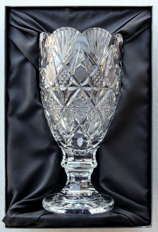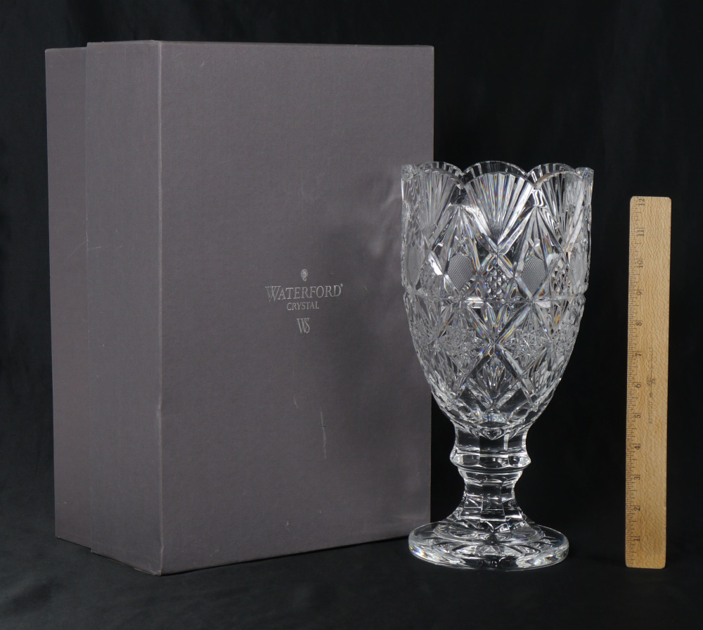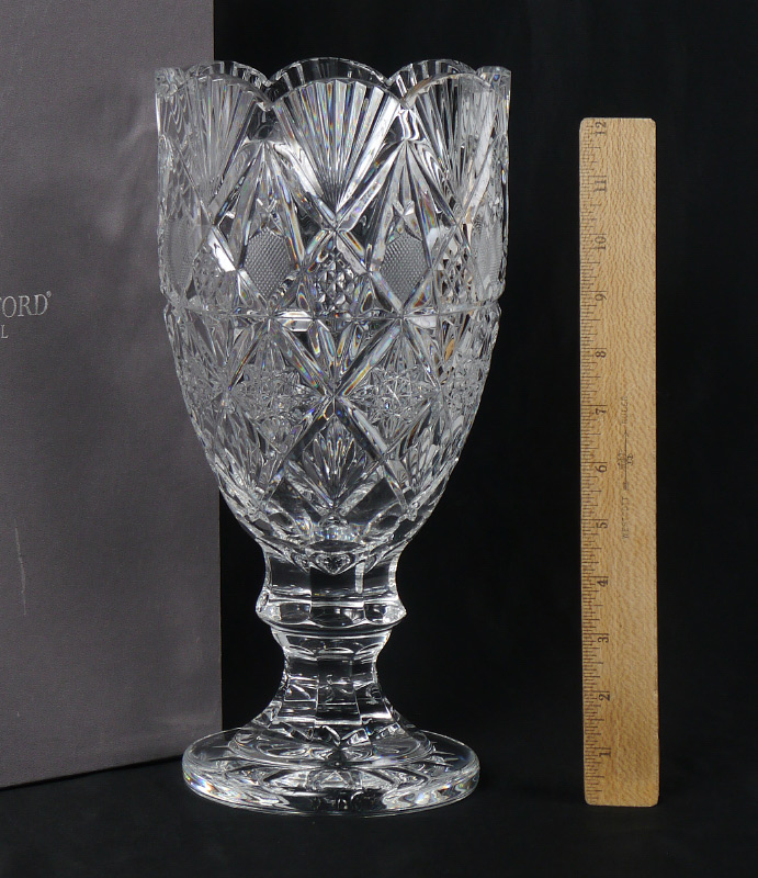 WATERFORD SOCIETY SINCLAIR VASE IN ORIGINAL BOX: Created for the Waterford Society, number #178 of a 1000. Signed Jim O'Leary on foot. Measures 13'' h. x 5'', original box measures 7'' x. 16 3/4'' x 11''.