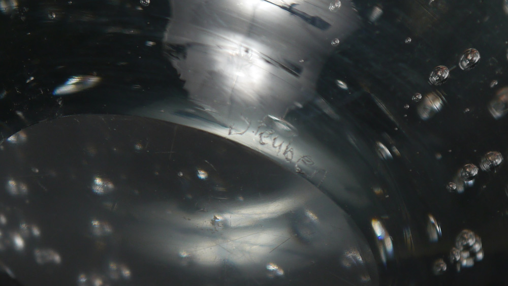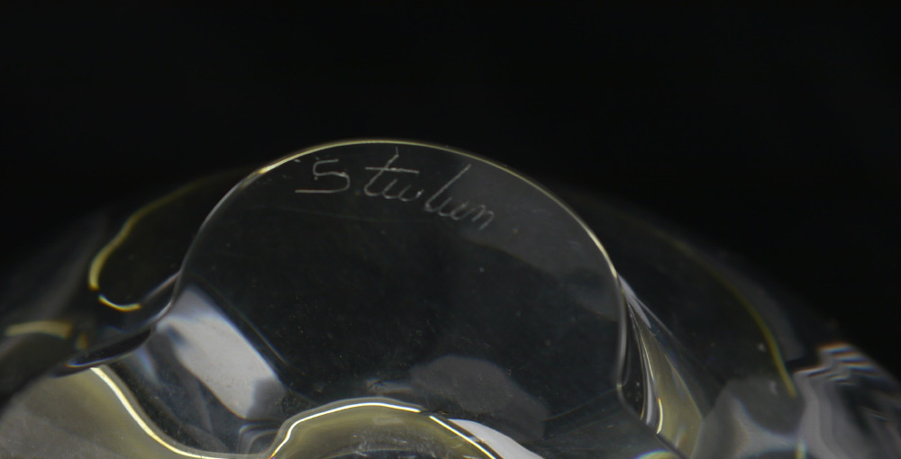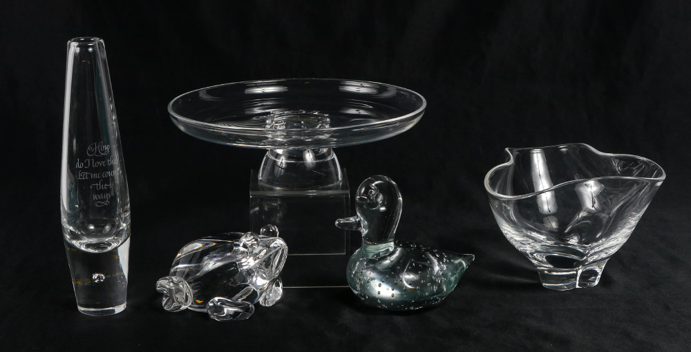 5 PIECE STEUBEN CLEAR GLASS COLLECTION: Assembled collection of 5 pieces, all signed Steuben, to include 1) Footed tray, 2 3/8'' h. x 8 1/8''. 2) Bowl with ruffled rim, 3 7/8'' h. x 5 1/2''. 3) Bud vase with engraved romantic motto, 8'' h. 4) Control bubble duck, 4 1/8'' h. 5) Frog, 4 3/8'' long.