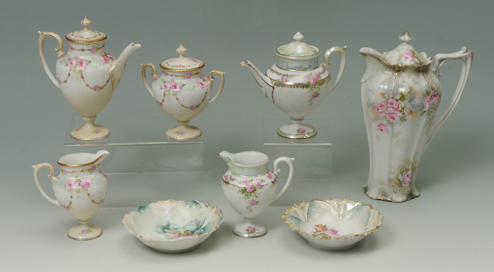 8 PIECE RS PRUSSIA PORCELAIN COLLECTION: An assembled collection of 8 floral decorated pieces by RS Prussia to include 1) Chocolate pot, 10'' x 7''. 2-3) Chocolate pot, 6 1/8'' h. and matching creamer. 4-6) 3 pieces matching chocolate set, pot 7'' h. 7-8) Pair of bowls, 5 3/4''.