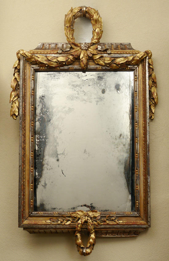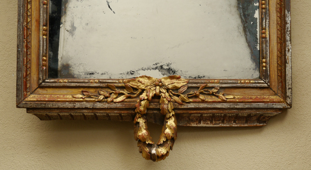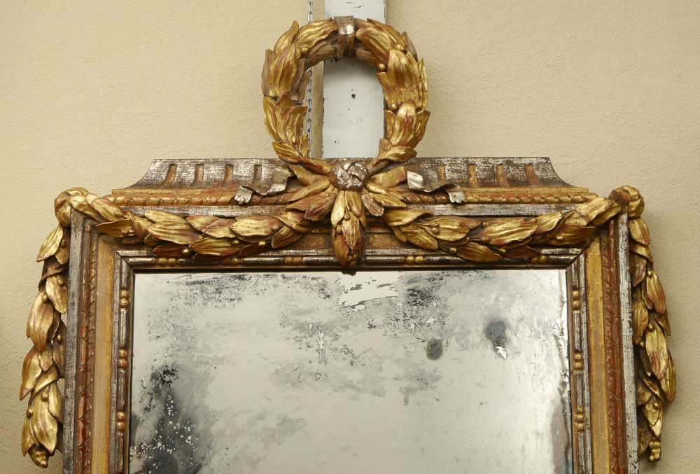 DECORATIVE GOLD GILT MIRROR: Antiqued contemporary carved frame wall mirror, overall measures 45 1/4'' h. x 29'' x 2 1/4''.