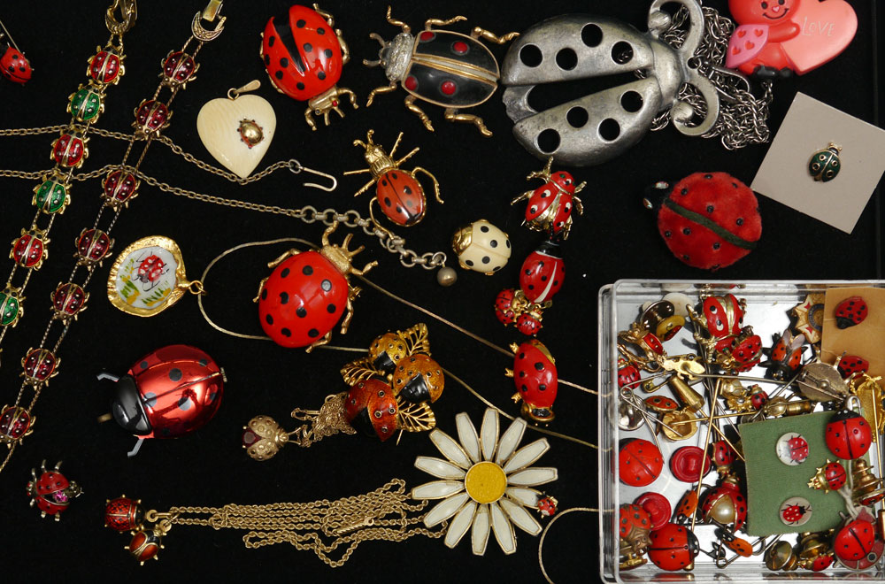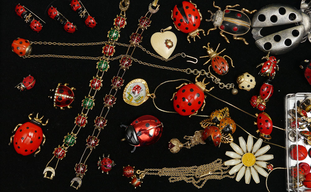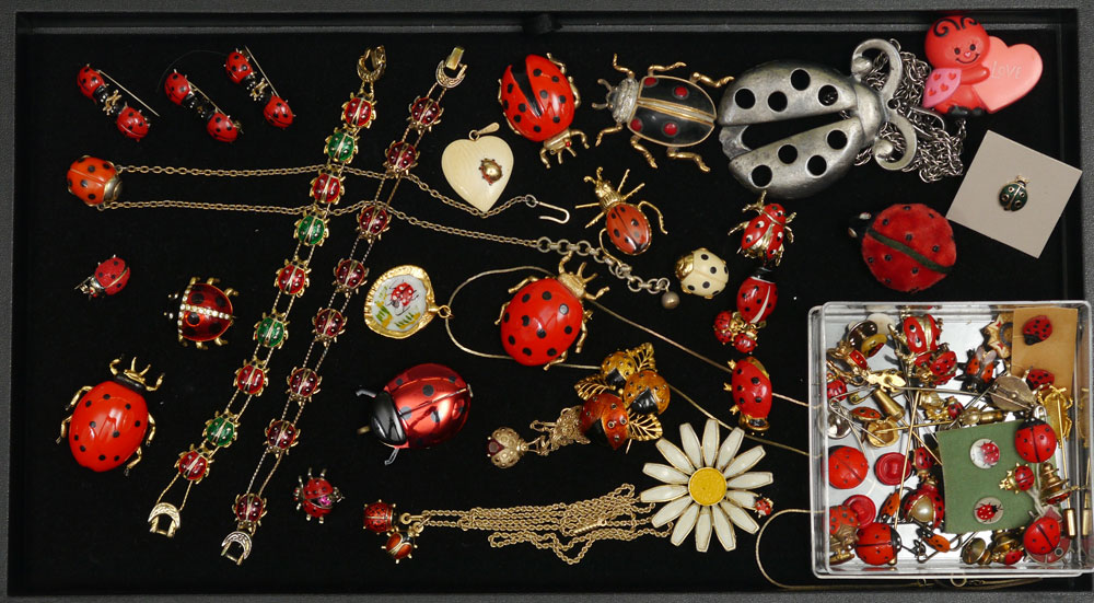 LADY BUG COSTUME JEWELRY: Personal Collection of Irene Becker, the artist known as The Lady Bug Approx. 50 pieces to include earrings, necklaces, pins, and bracelets, a few are 14k gold.