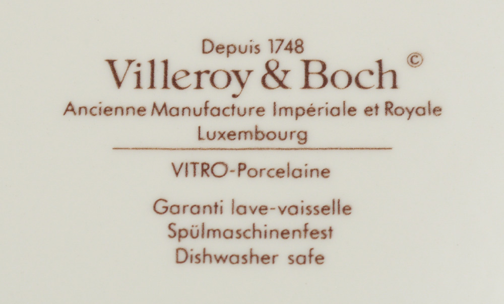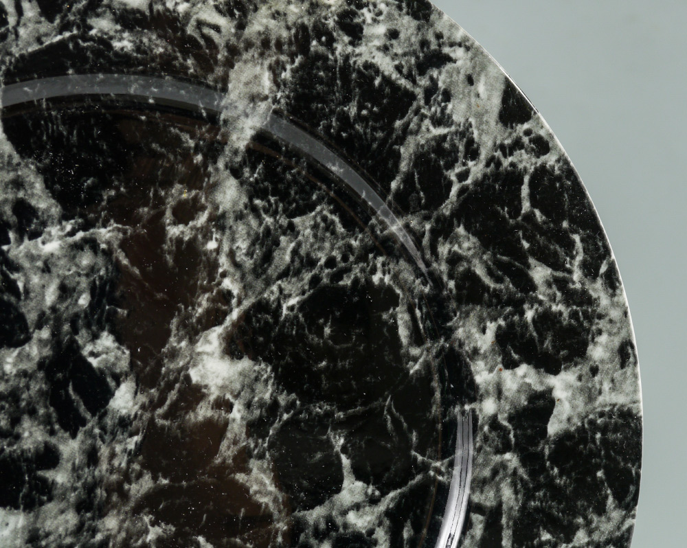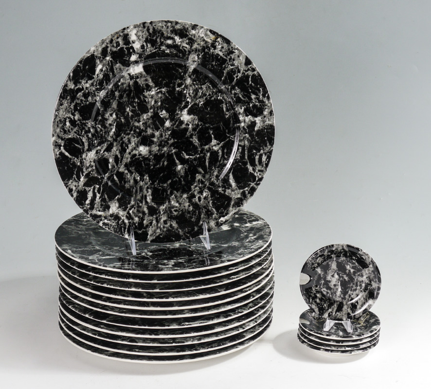 12 VILLEROY & BOCH BLACK MARBLE SERVICE PLATES: 17 pieces in the Black Marble pattern by Villeroy & Boch to include 12 service plates (11 1/4''), 5 ashtrays (4'').